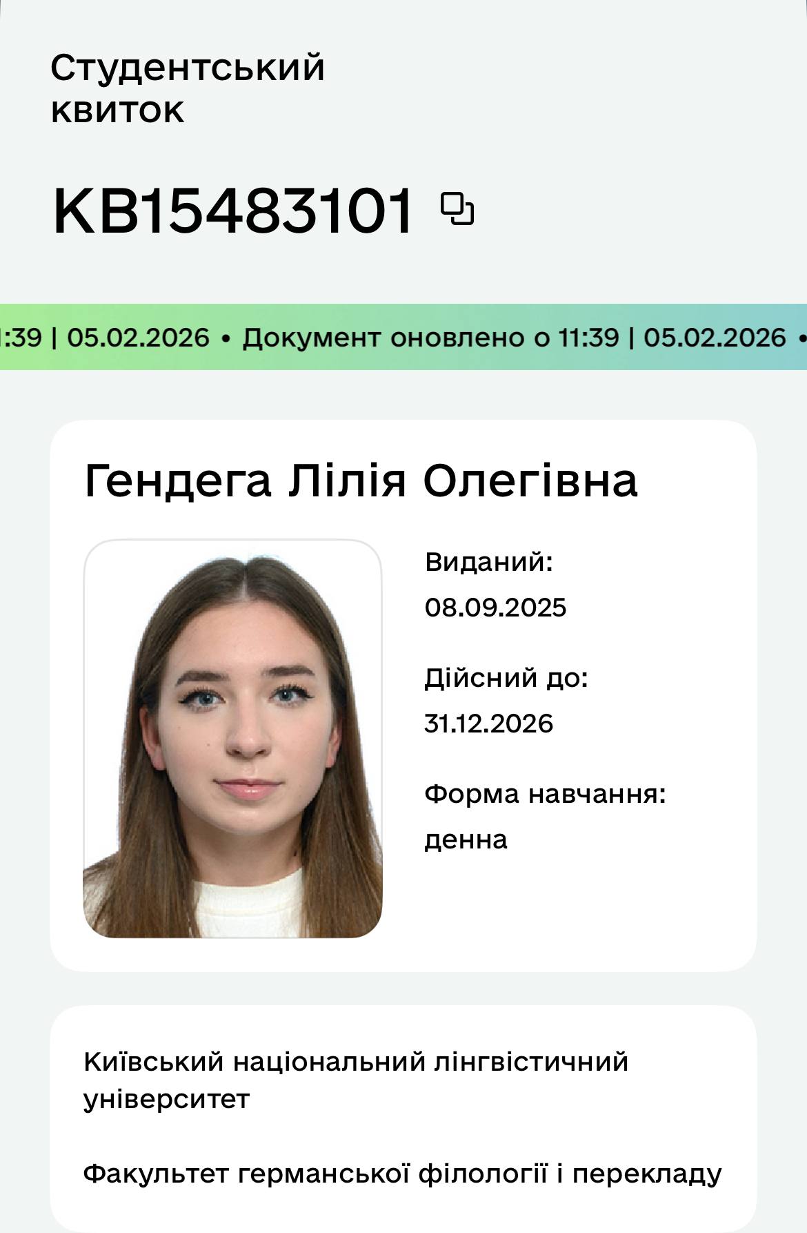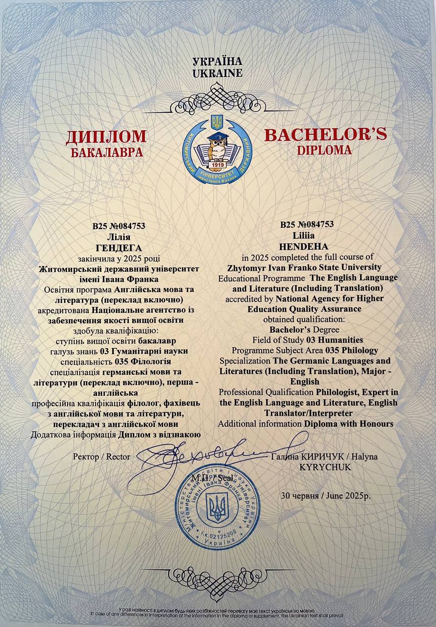 У 2025 році я здобула ступінь бакалавра у Житомирському державному університеті імені Івана Франка за спеціальністю Філологія (освітня програма - Англійська мова та література (переклад включно)). Диплом бакалавра у мене з відзнакою *(диплом прикріпляю).