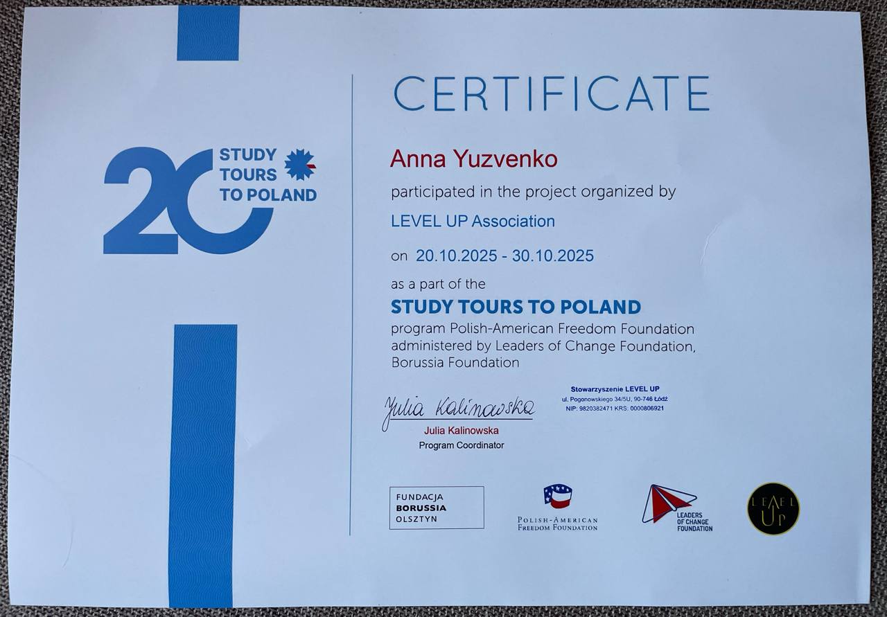 Здобуваю вищу філологічну освіту в Київському національному лінгвістичному університеті. Мій академічний рівень підтверджено першими місцями на олімпіадах з англійської мови та у конкурсі наукових робіт МАН. Цьогоріч отримала грант у розмірі 17 000 грн за високі досягнення у навчанні та громадській діяльності.