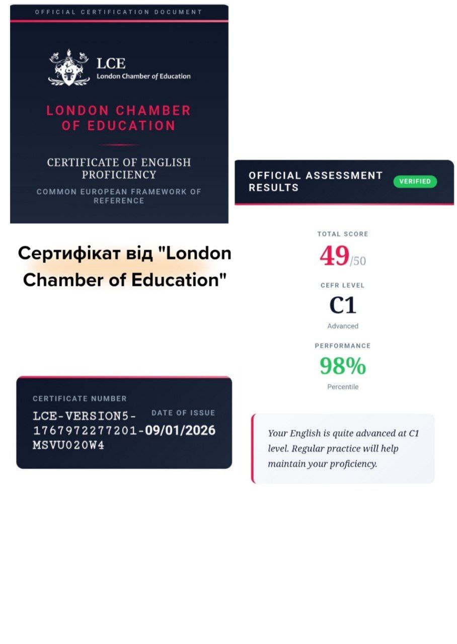 Я - репетитор англійської мови, який пояснює без страху помилок. Маю міжнародний сертифікат рівня C1. На заняттях - підтримка, живі приклади й багато практики, щоб англійська перестала бути просто предметом і стала справжнім інструментом для життя. Допомагаю учням повірити в себе, заговорити впевнено й бачити реальний прогрес уже з перших уроків.