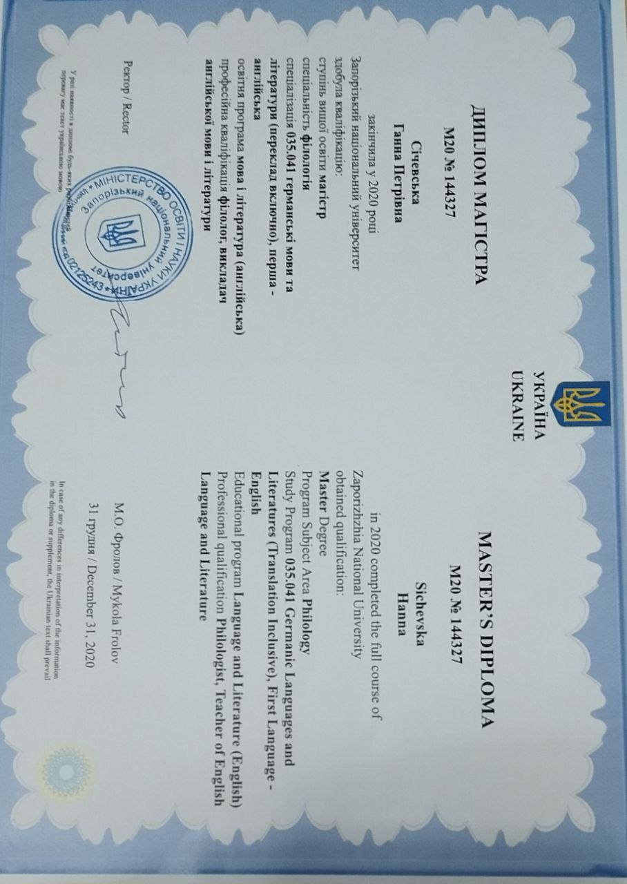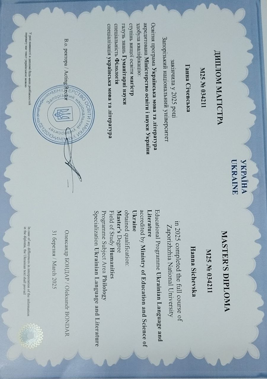Моя мета - не лише навчити, а й підтримати дитину, розвинути її впевненість у собі та мотивацію до навчання. Проводжу індивідуальні заняття з англійської мови, а також допомагаю учням із домашніми завданнями з усіх предметів. У своїй роботі поєдную педагогіку, психологію та сучасні освітні підходи, щоб навчання було ефективним, цікавим і результативним. Мій професійний досвід охоплює роботу не лише у школі, а й у дитячому садочку, де я працювала вихователем і готувала дітей до вступу до школи. Я добре розумію вікові особливості дітей та вмію створювати безпечне, підтримувальне навчальне середовище. Я - учитель і репетитор англійської мови та української мови і літератури для учнів 1–11 класів з педагогічним стажем понад 10 років. Маю чотири дипломи магістра за спеціальностями: філолог (англійська мова та література), філолог (українська мова та література), психолог, вихователь дошкільної освіти.
