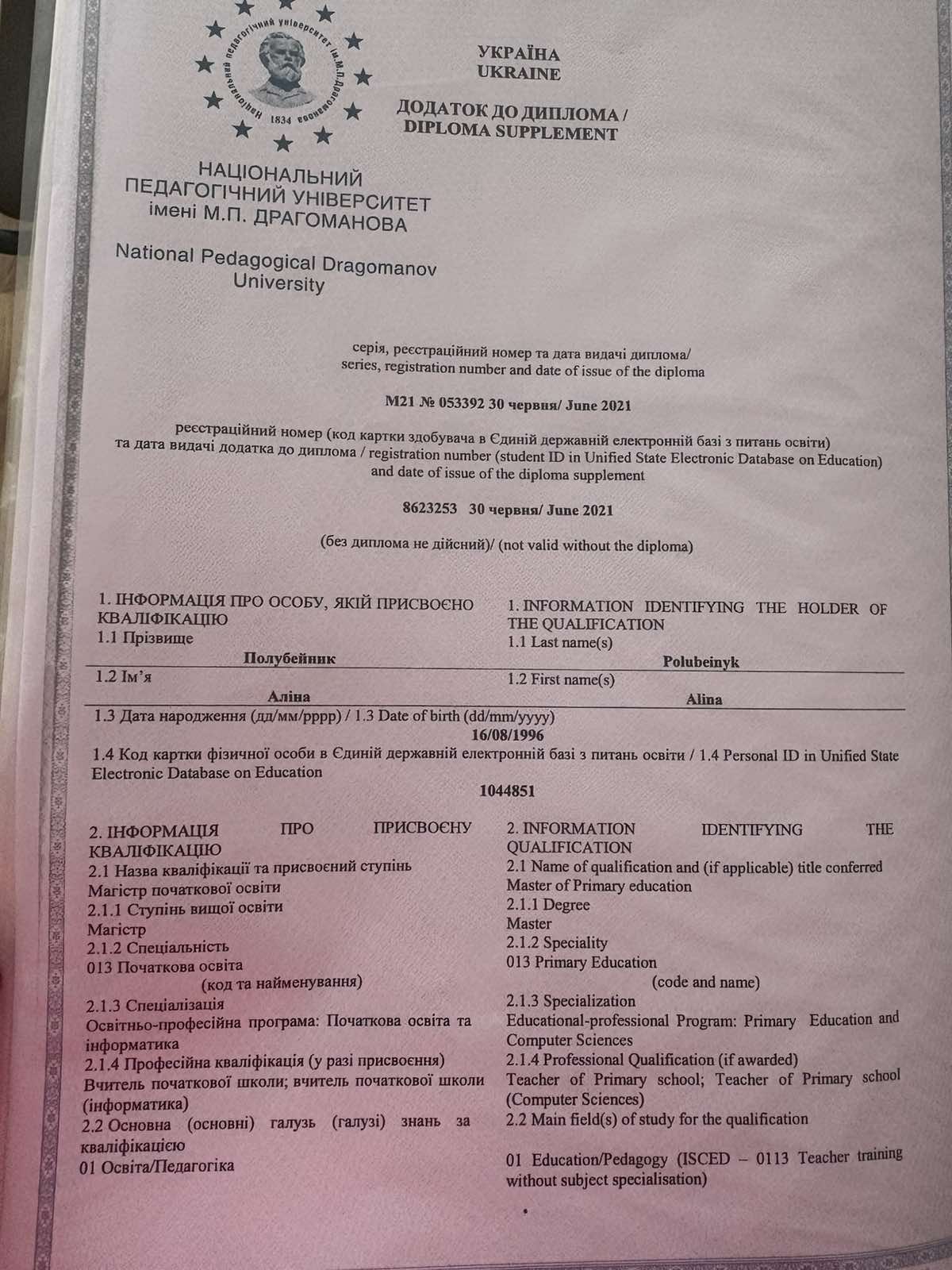 Вчитель початкових класів Досвід роботи 6 років