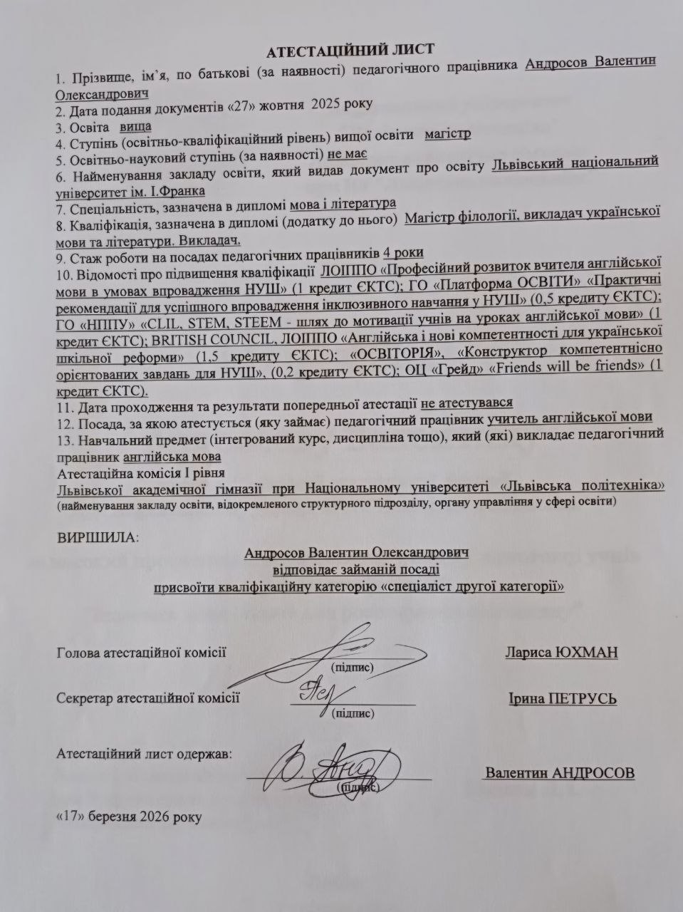 Деталі про досвід викладання: