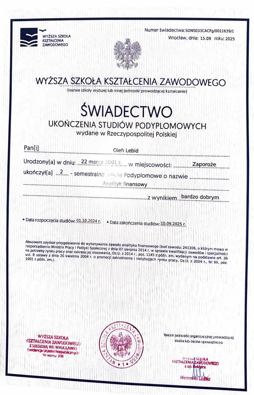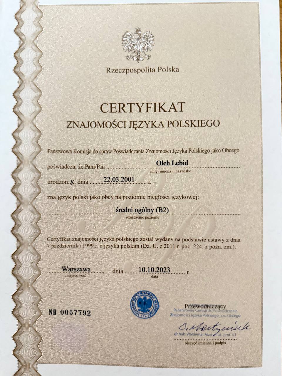 - Certyfikat ukończenia kursu języka polskiego jako obcego na poziomie B1 (22.08.2022 r.)