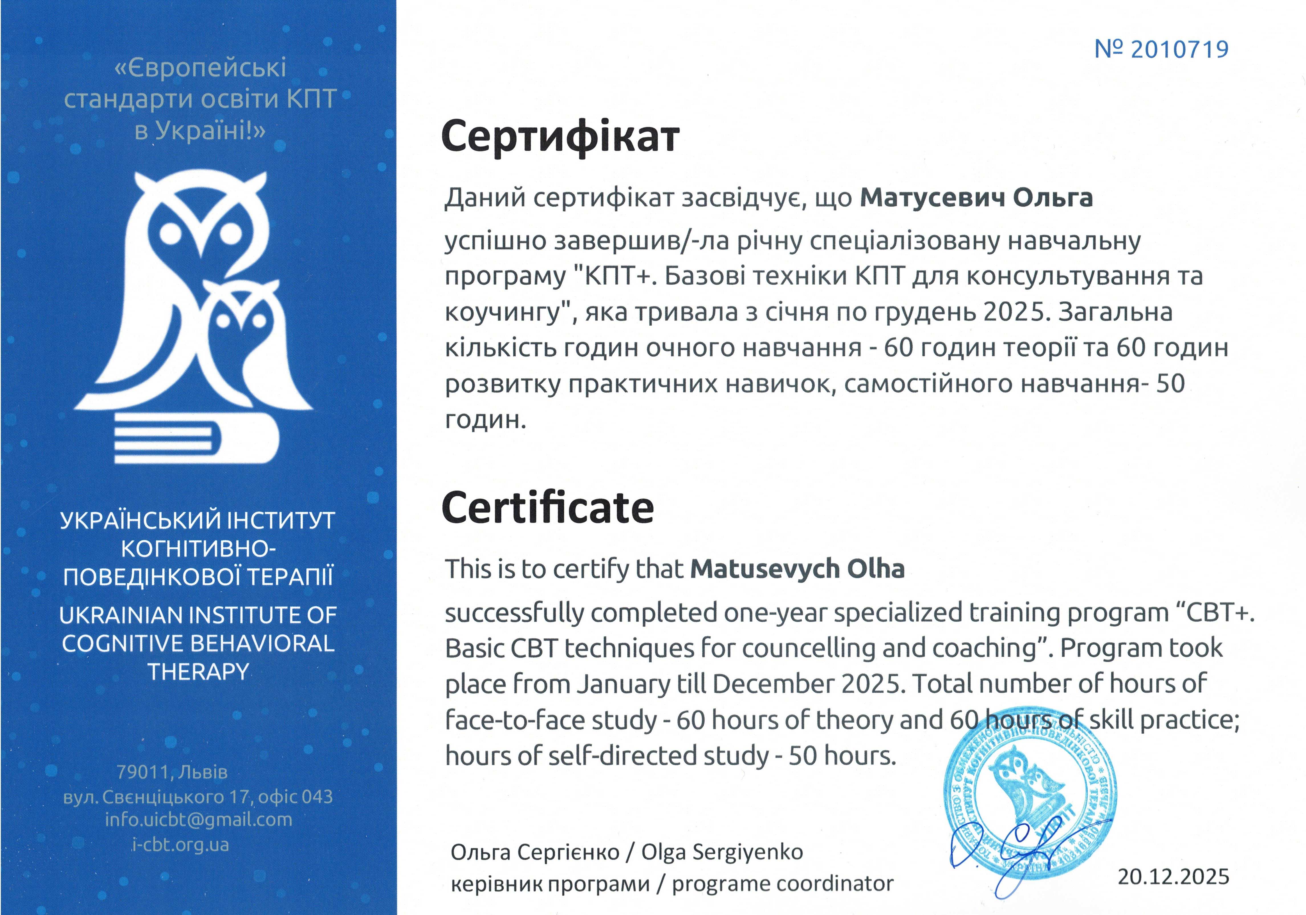 Когнітивно-поведінкова терапія (КПТ) — для подолання тривожності, формування впевненості в собі та здорових моделей поведінки.