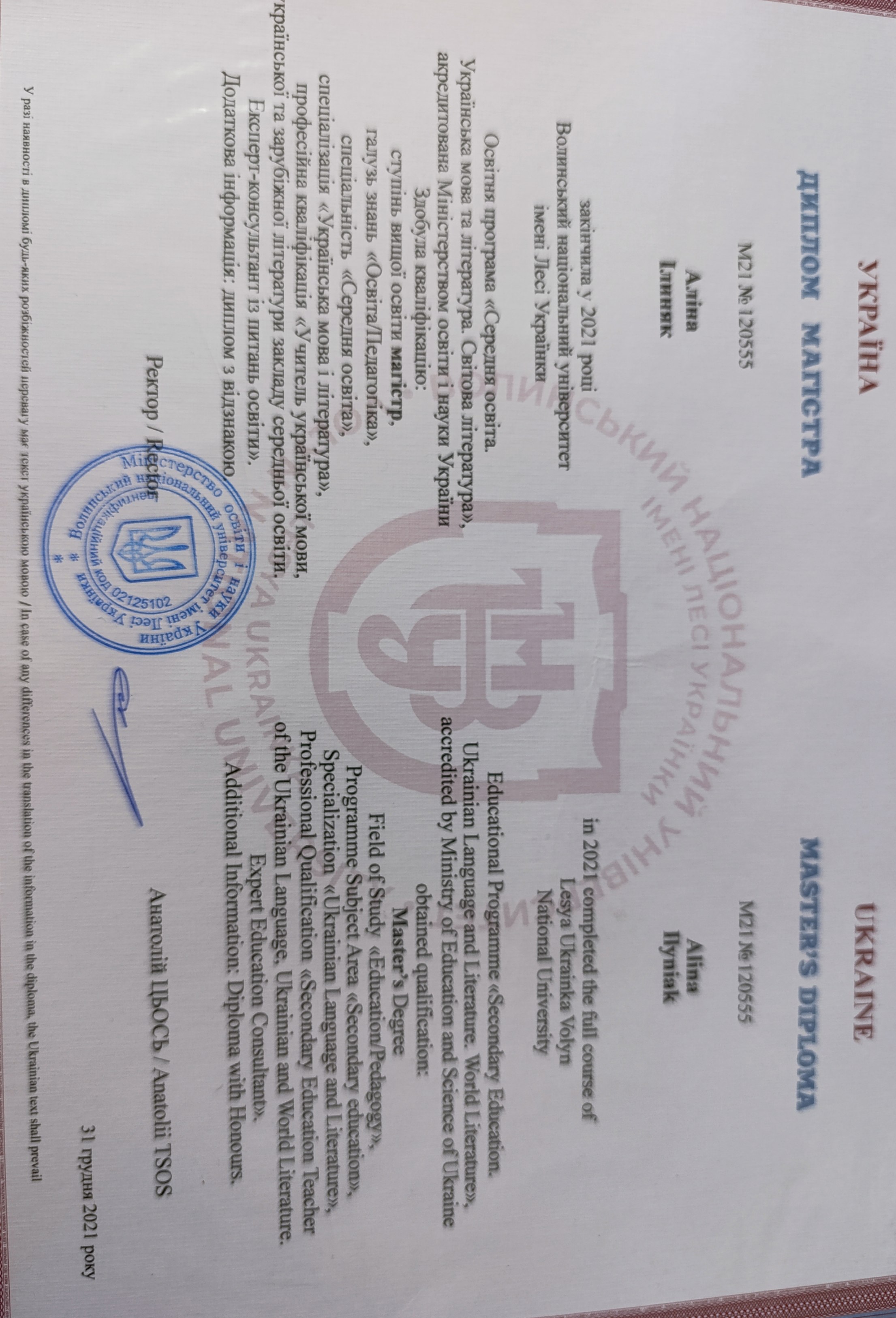 Мене звати Аліна. Працюю вчителем української мови та літератури. На своїх уроках я використовую різні сучасні методики й інтерактивні підходи: ігрові технології, роботу в групах, мультимедійні матеріали, проєкти. Я постійно проходжу курси підвищення кваліфікації, щоб удосконалювати педагогічну майстерність і робити навчання цікавим та ефективним.