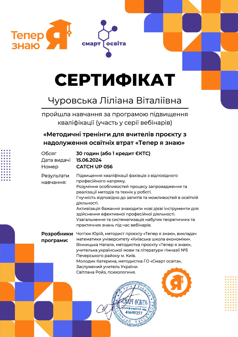 * Технології замість нудьги: використовую гейміфікацію (Kahoot!/Quizizz), візуальні схеми та сучасні медіа для легкого засвоєння граматики та літератури.