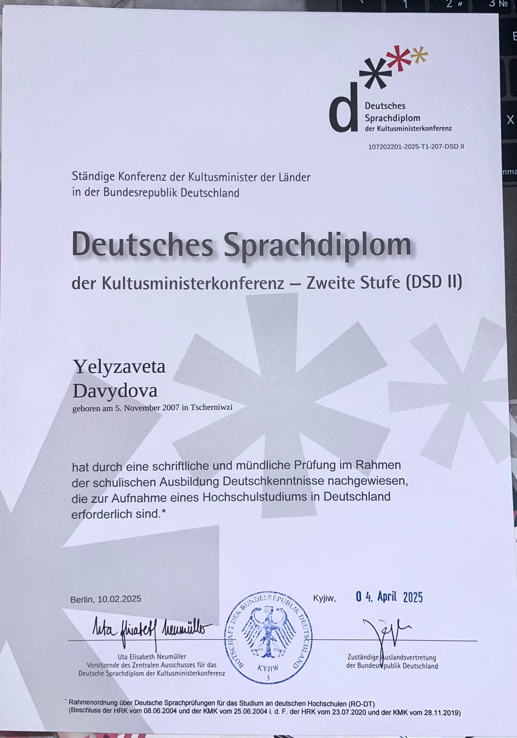 Я - викладач німецької мови з філологічною освітою та міжнародними DSD-дипломами B1 і C1. Пояснюю складні теми та граматику просто й зрозуміло. З першого заняття студенти починають говорити німецькою, вчаться висловлювати думки та розуміти живу мову. Орієнтуюся на цілі студента та допомагаю впевнено застосовувати німецьку на практиці.