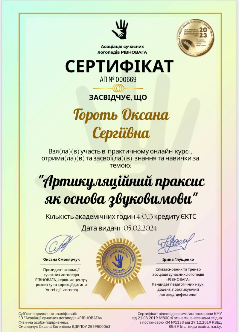Привіт! Мене звати Оксана. Я працюю логопедом уже понад 3 роки. Дуже люблю дітей і з радістю допомагаю покращити звукову мову, мовленнєве дихання, артикуляційний апарат, вимову звуків, розвиток дрібної моторики, психічних функцій та комунікативних навичок