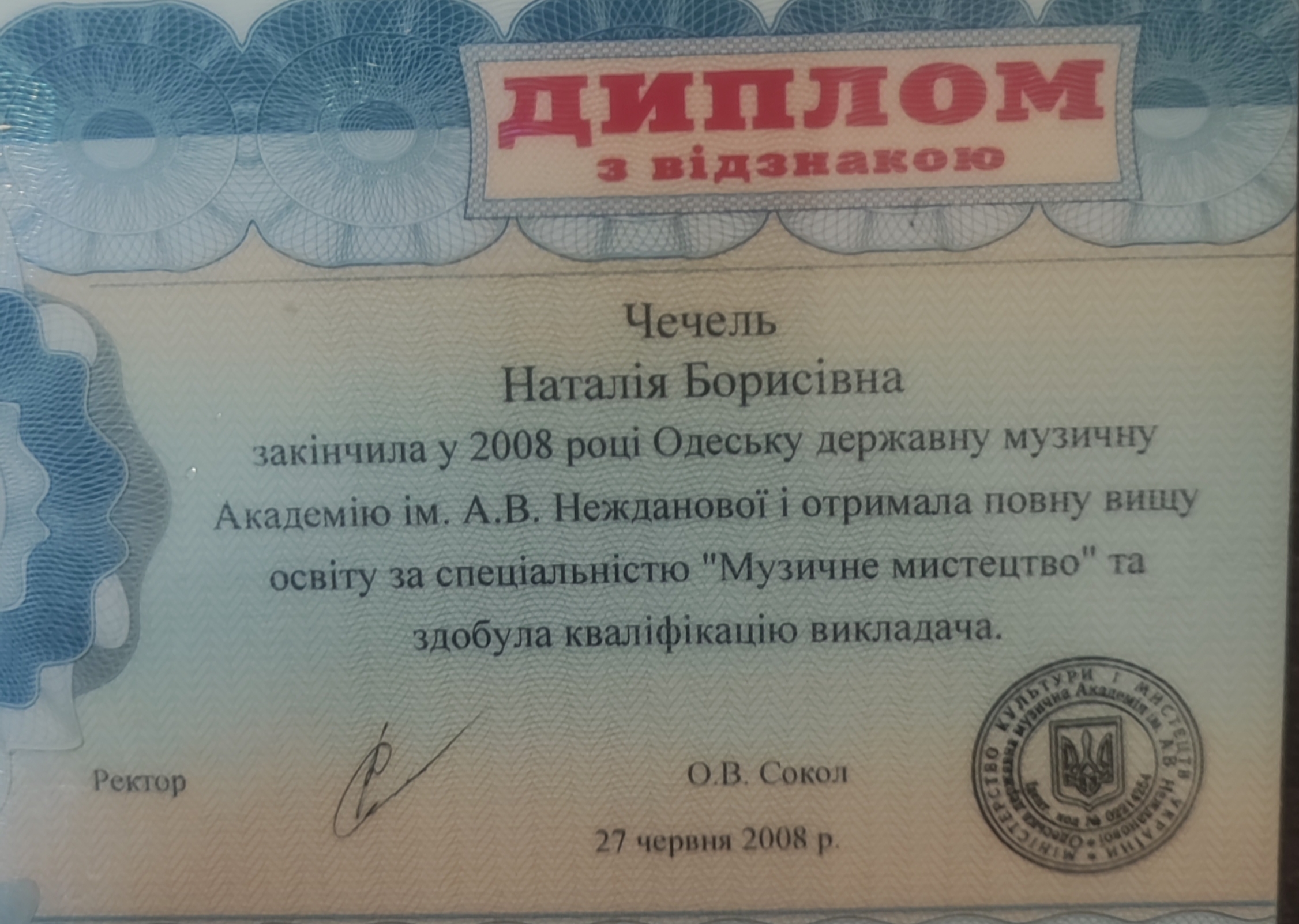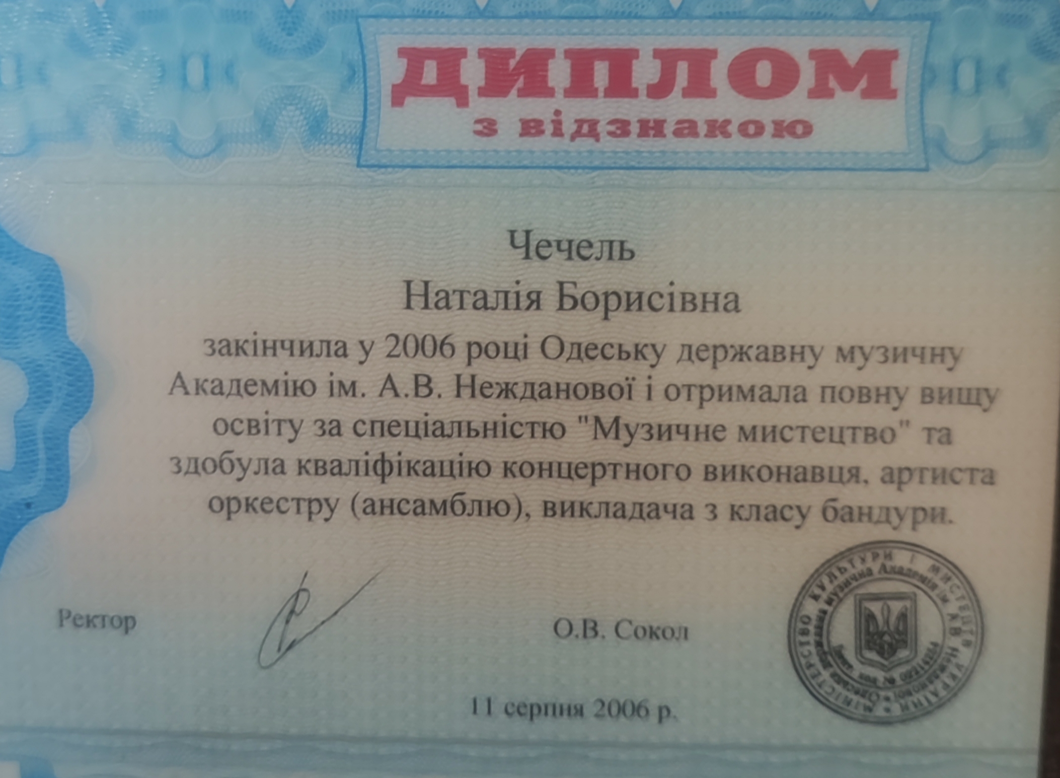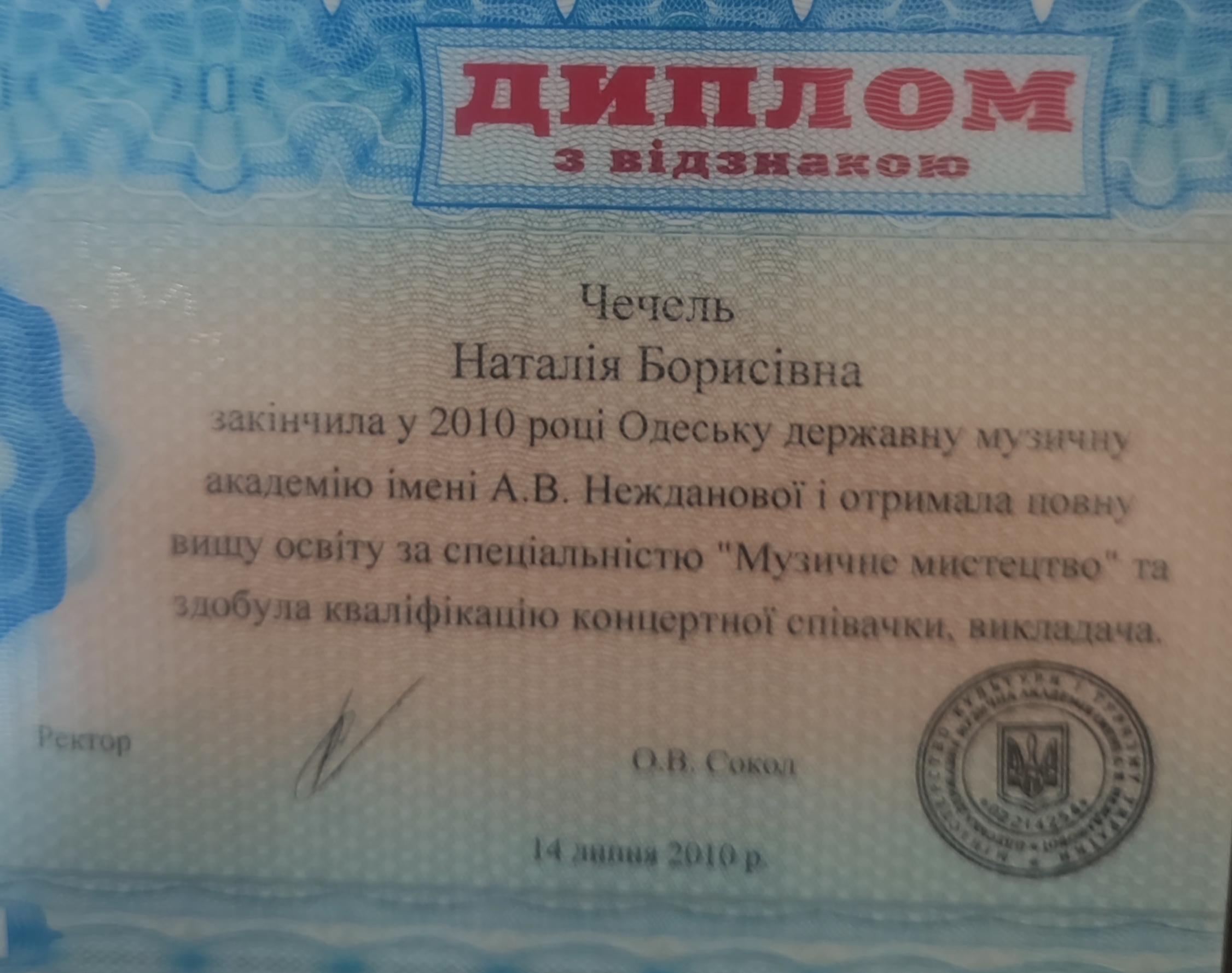 Привіт! Мене звуть Наталя. Викладач вокалу та бандури. Освіта Одеська національна академія ім. А.В. Нежданової. Лауреат міжнародних конкурсів, магістр. Артистка Одеського оперного театру опери та балету.