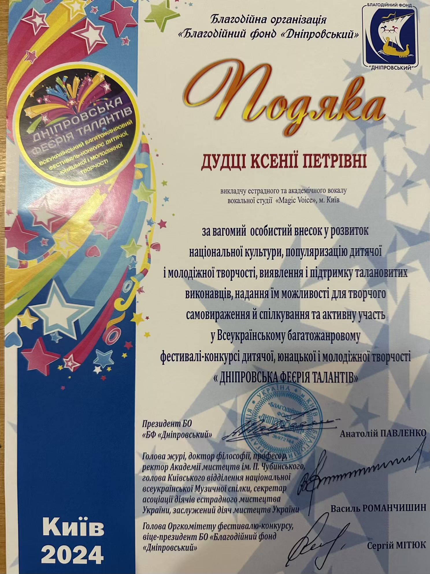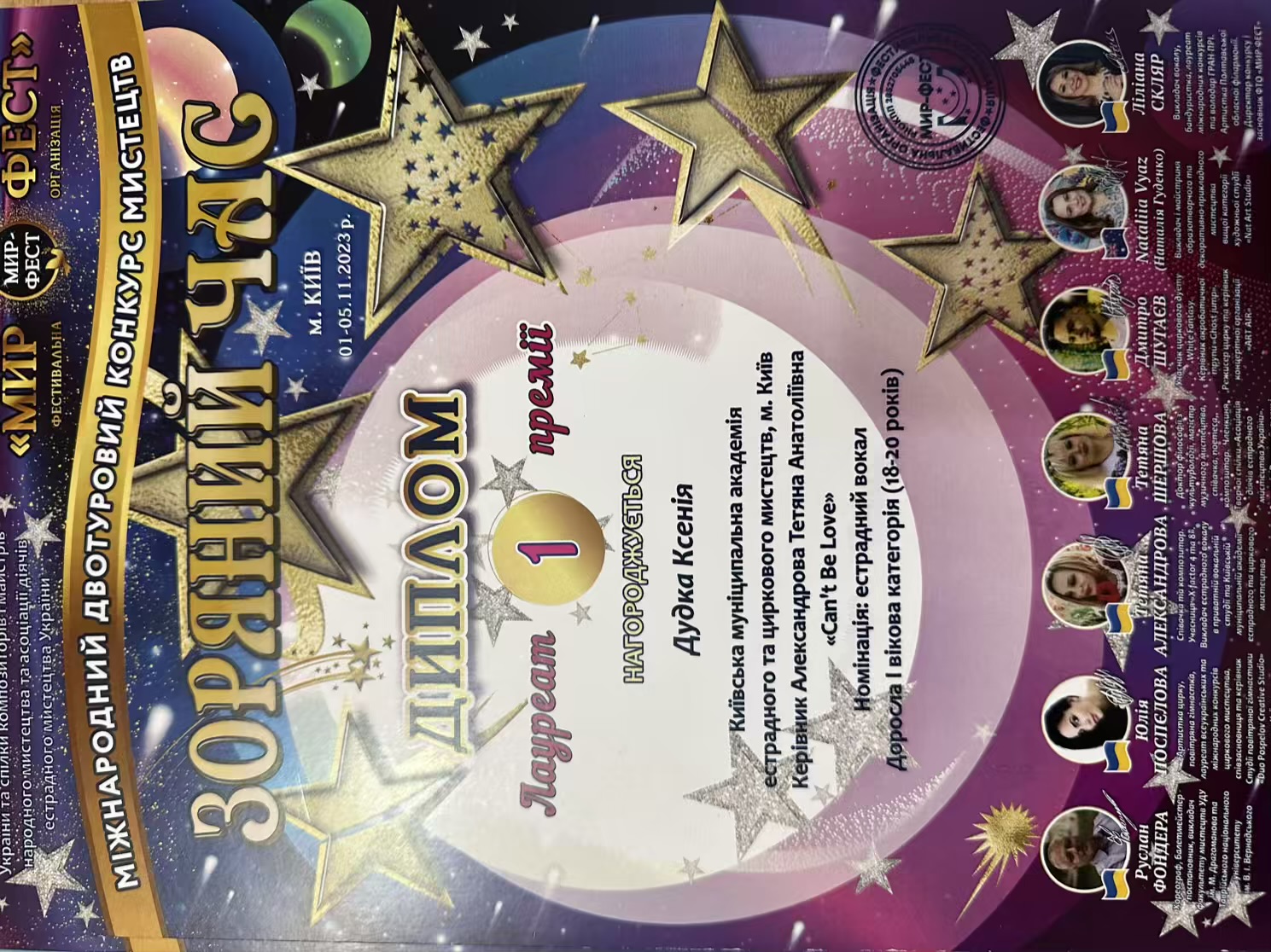 Професійно займаюсь вокалом понад 8 років. Маю досвід концертної діяльності, участі у всеукраїнських та міжнародних конкурсах та фестивалях. Постійно вдосконалюю свої навички та відвідую консультації й тренінги у зіркового тренера Алекса Шелеста, учасниці X-factor Тетяни Александрової та Melada Vocal