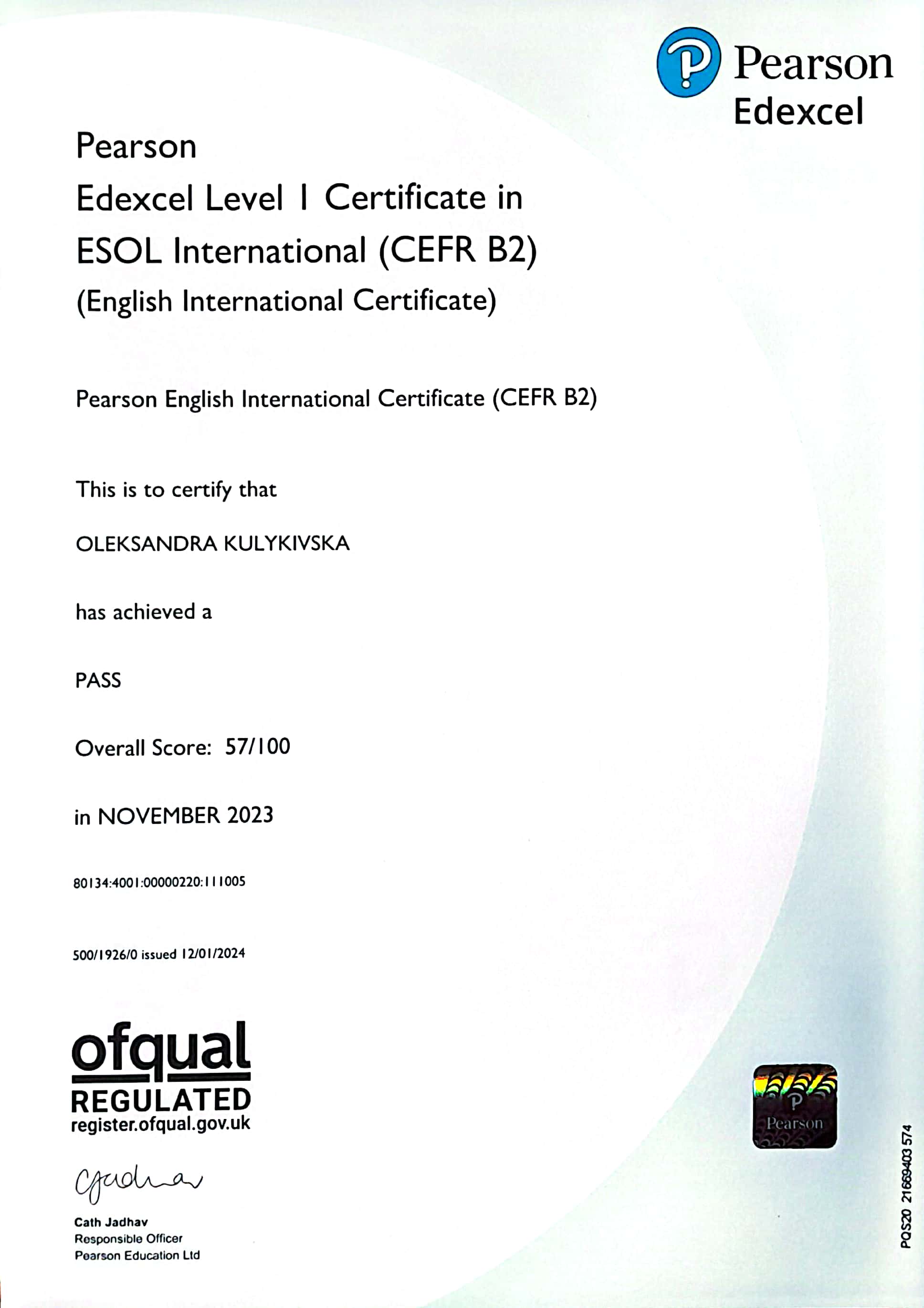 Сертифікована репетиторка англійської мови (рівень B2, сертифікат PTE). Навчаю за сучасними комунікативними методиками, готую до НМТ та міжнародного іспиту PTE, допомагаю заговорити англійською вільно