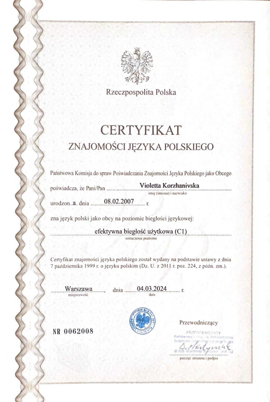Мене звати Віолетта. Вже майже 4 роки я проживаю у Варшаві. Наразі навчаюся у Варшавському університеті на спеціальності «Міжнародні відносини». Викладаю польську мову вже більше року. Сама вивчила мову менше ніж за 2 роки з А0 до С1. Успішно скала державний іспит на рівні С1.
