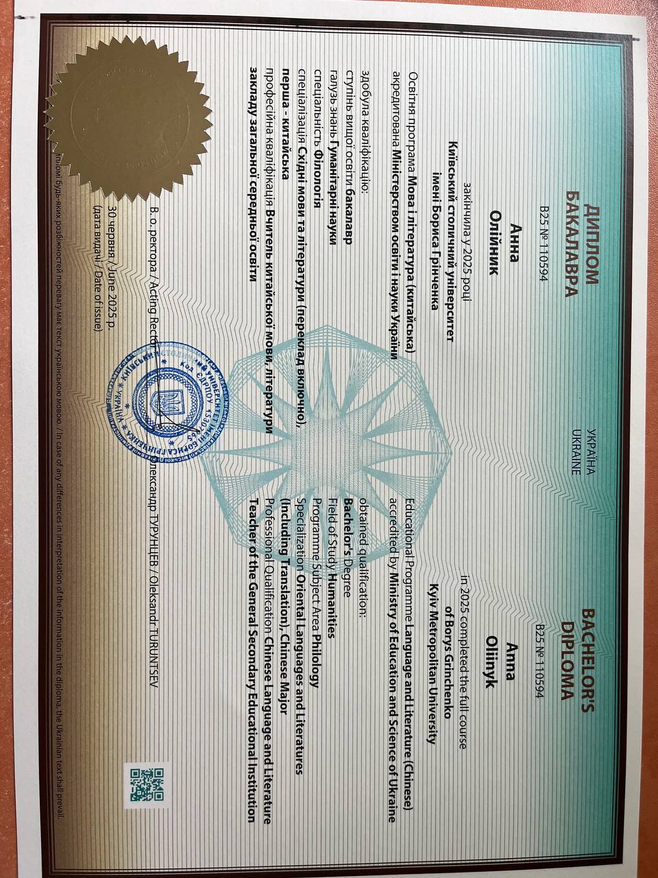 Я закінчила Київський столичний університет імені Бориса Грінченка, де вивчала китайську мову та літературу, а зараз продовжую навчання в магістратурі за тією ж спеціальністю. Добре розумію, як працює мова зсередини, і вмію пояснювати складні речі простою мовою.