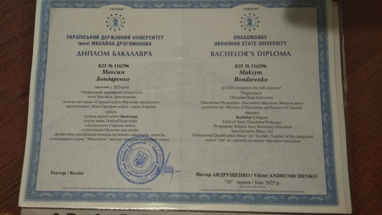 Також маю вищу музично-педагогічну освіту, тому за бажанням можу навчити читати ноти, розбиратися в акордах і основах теорії музики.