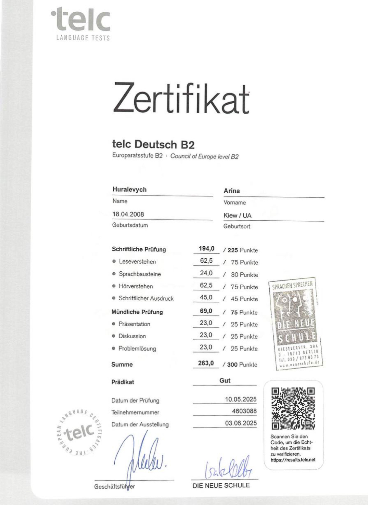 Ich heiße Arina Huralevych und bin Nachhilfelehrerin für Deutsch für Anfänger. Ich habe das Sprachniveau B2 und unterrichte Schüler*innen auf den Niveaustufen A1–A2. Ich erkläre alles einfach und verständlich, mit vielen Beispielen aus dem Alltag. Mein Ziel ist es, zu zeigen, dass Deutschlernen spannend, freundlich und leicht sein kann 💬