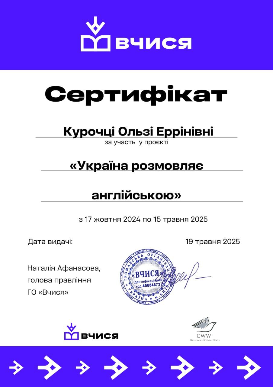 Я є активним учасником проєктів engin та " Україна розмовляє англійською", які дозволяють учням та вчителям практикувати англійську мову з носіями мови.