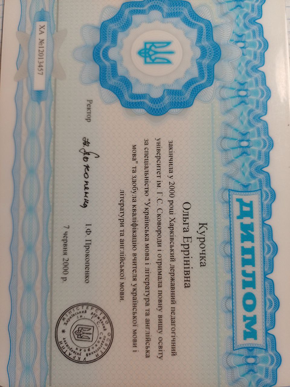 Маю вищу освіту. Закінчила "Харківській державний педагогічний університет ім Г.С.Сковороди" в 2000 році. Маю стаж роботи 25 років.