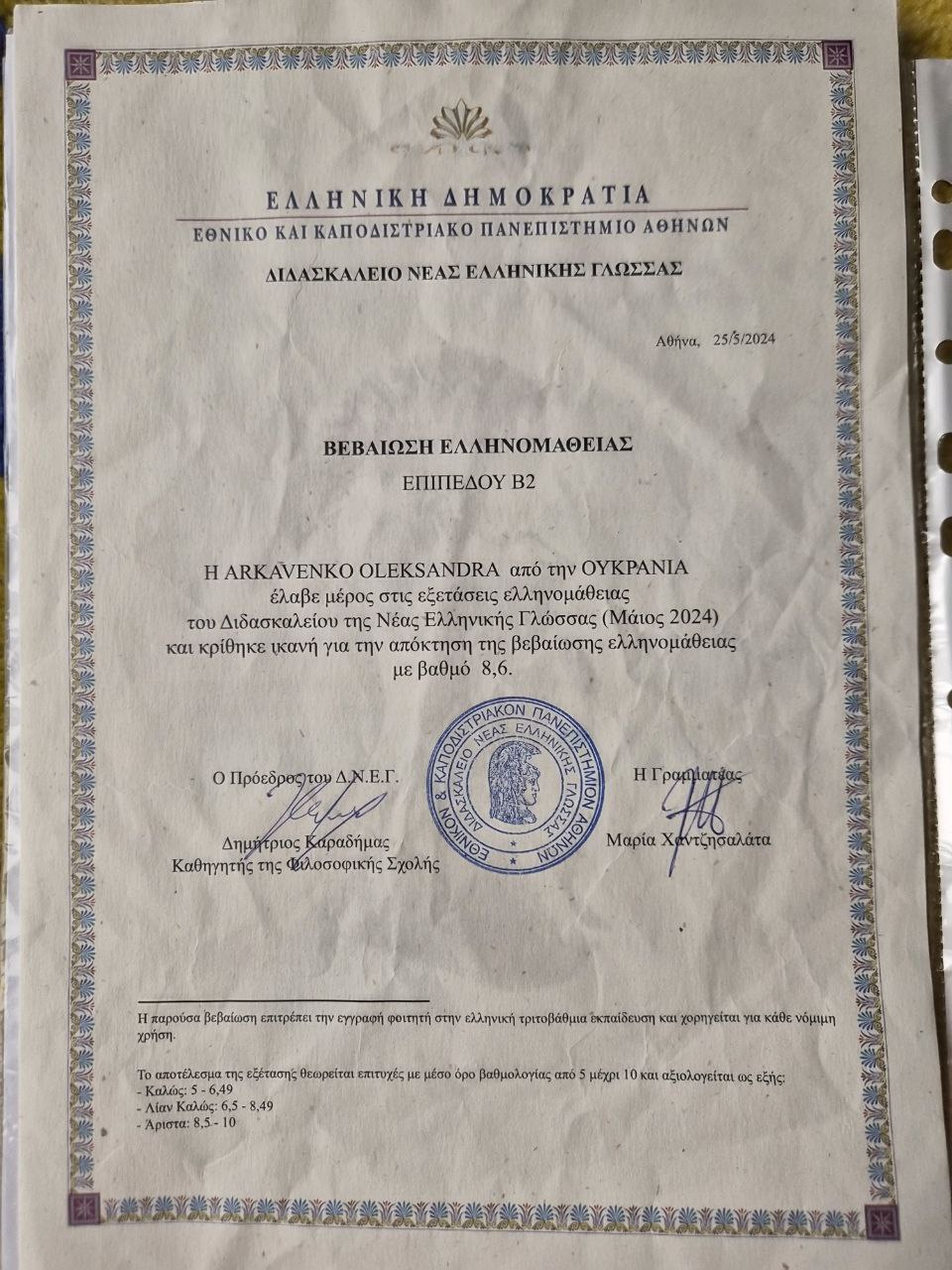 Привіт, мене звати Саша. Я студентка другого курсу університету імені Каподістрії, і знаходжуся в Греції вже майже чотири роки. Я маю сертифікат грецької мови рівня В2, і також маю рік досвіду викладання.