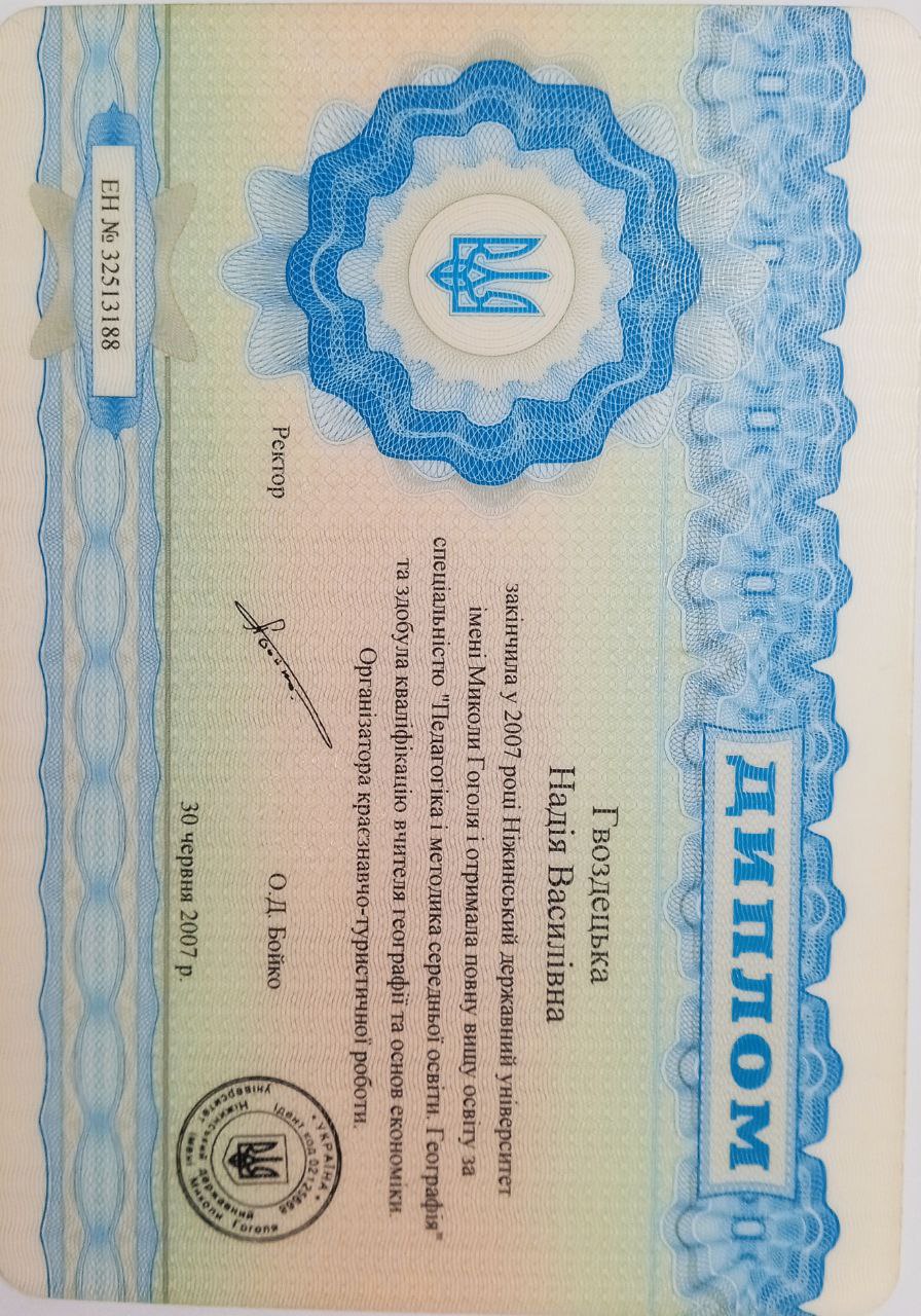 1) Ніжинський державний університет імені М.В. Гоголя, 2007 рік (спеціаліст);