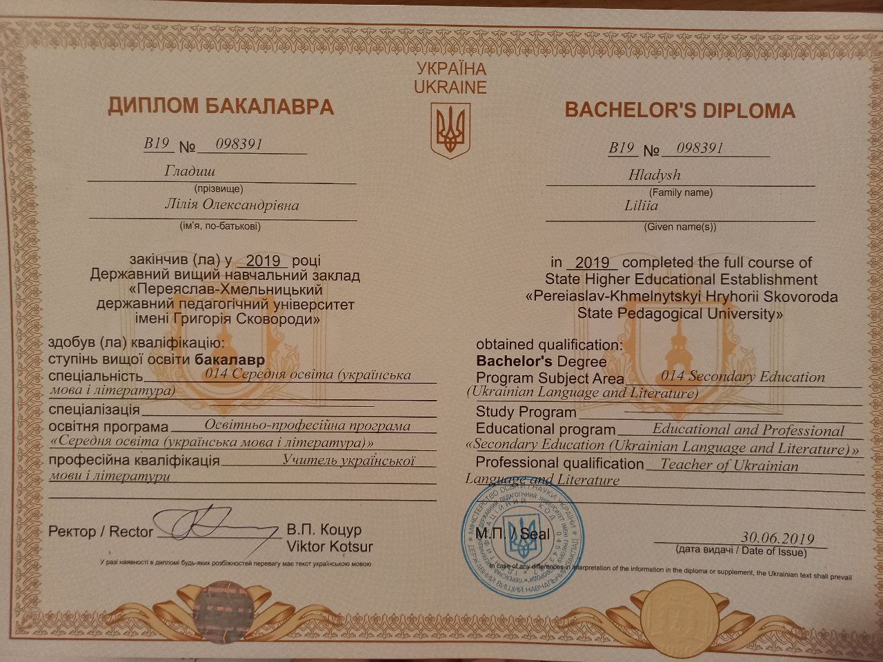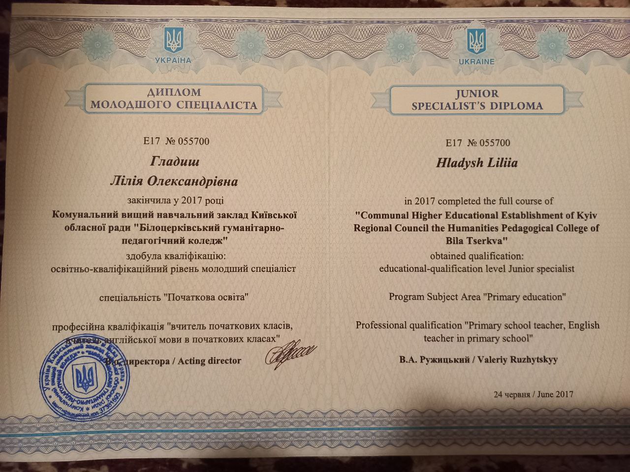 Першу освіту отримала у Білоцерківському педагогічному коледжі, на факультеті початкова освіта і англійська мова в початкових класах. Займалась з дітьми математикою і англійською мовою, також допомагала з письмом. Можу допомагати дитині з домашніми завданнями під запит.