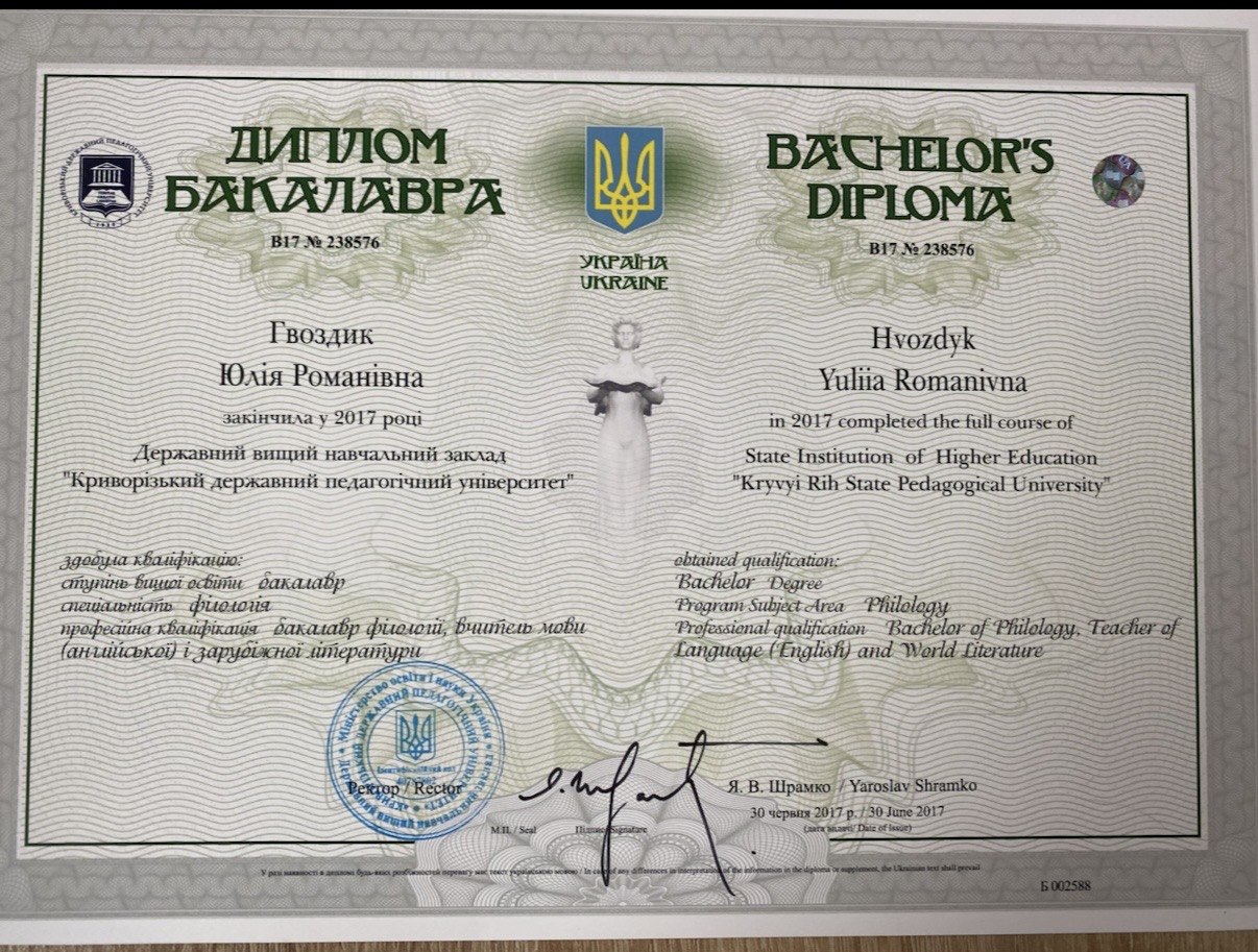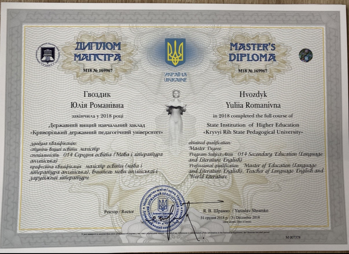 Здобувши вищу педагогічну освіту, я впевнено застосовую найкращі методики навчання, щоб кожен мій учень досяг успіху.