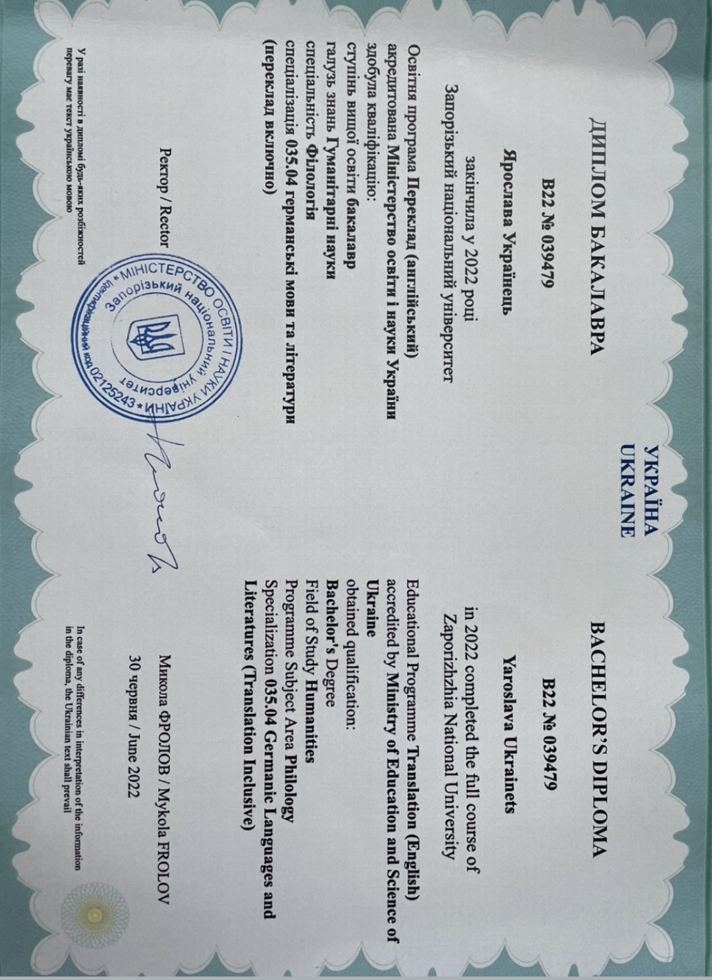 Я закінчила Запорізький національний університет у 2022 році за спеціальністю «Германські мови та літератури (переклад включно)». З дитинства люблю англійську, викладаю її дітям і дорослим. Підбираю теми за інтересами учнів, створюю доброзичливу атмосферу та допомагаю вчитися без страху помилитися.