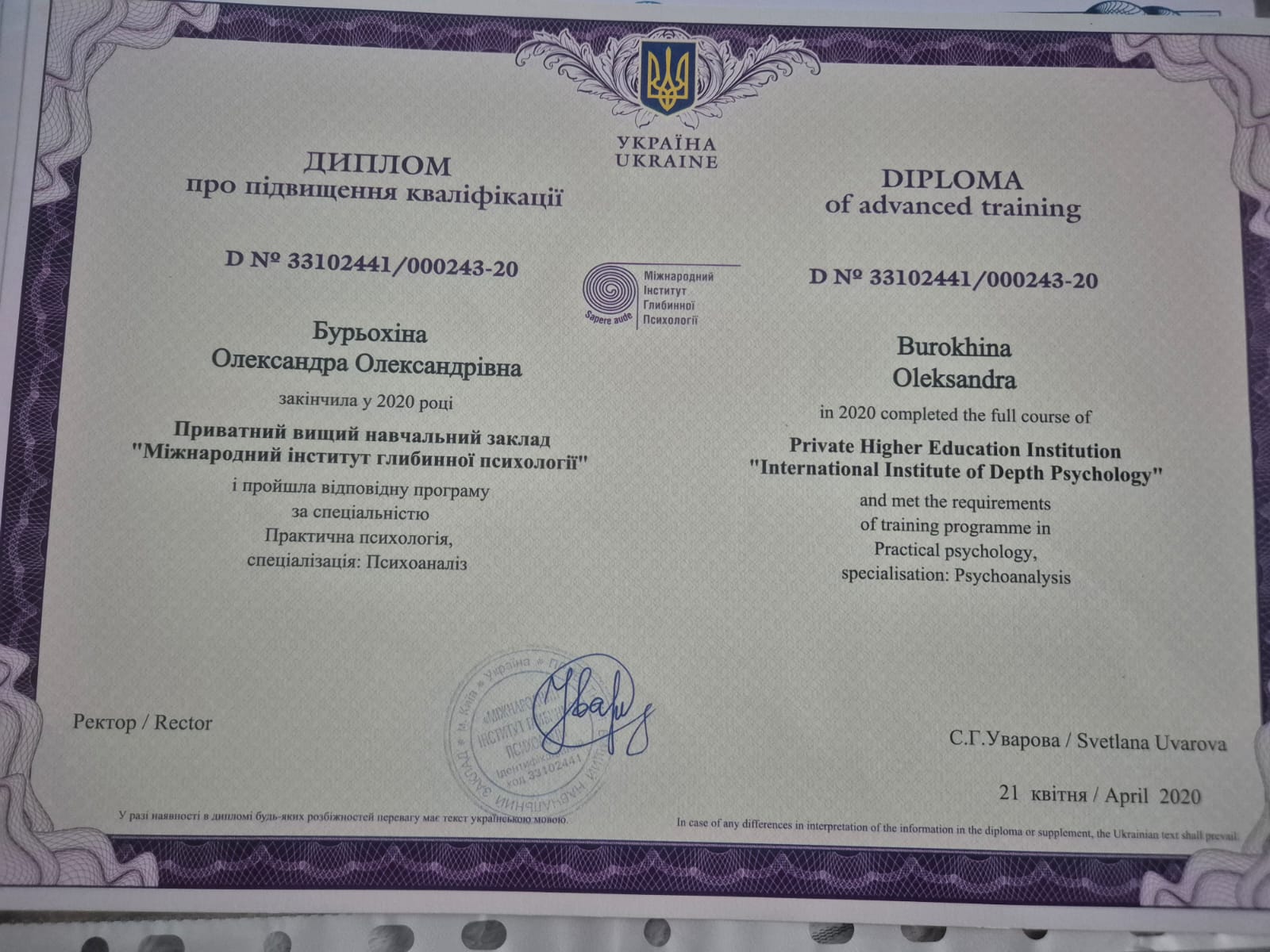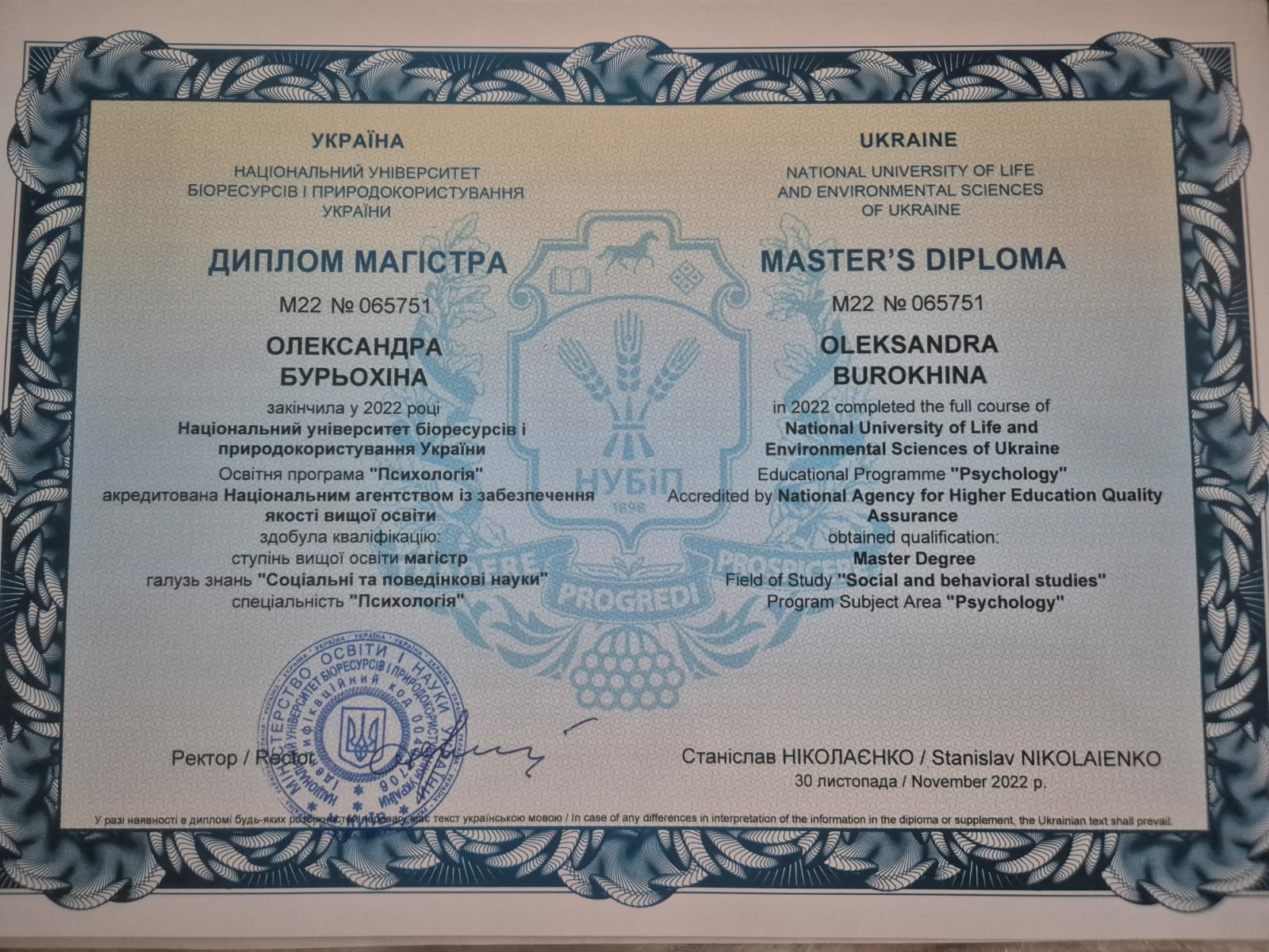 Я — магістр психології, консультантка з питань особистісного розвитку, емоційної регуляції та міжкультурної адаптації. Маю педагогічну освіту, багаторічний досвід роботи з людьми різного віку та культур, а також особистий досвід міграції й адаптації в європейському середовищі.