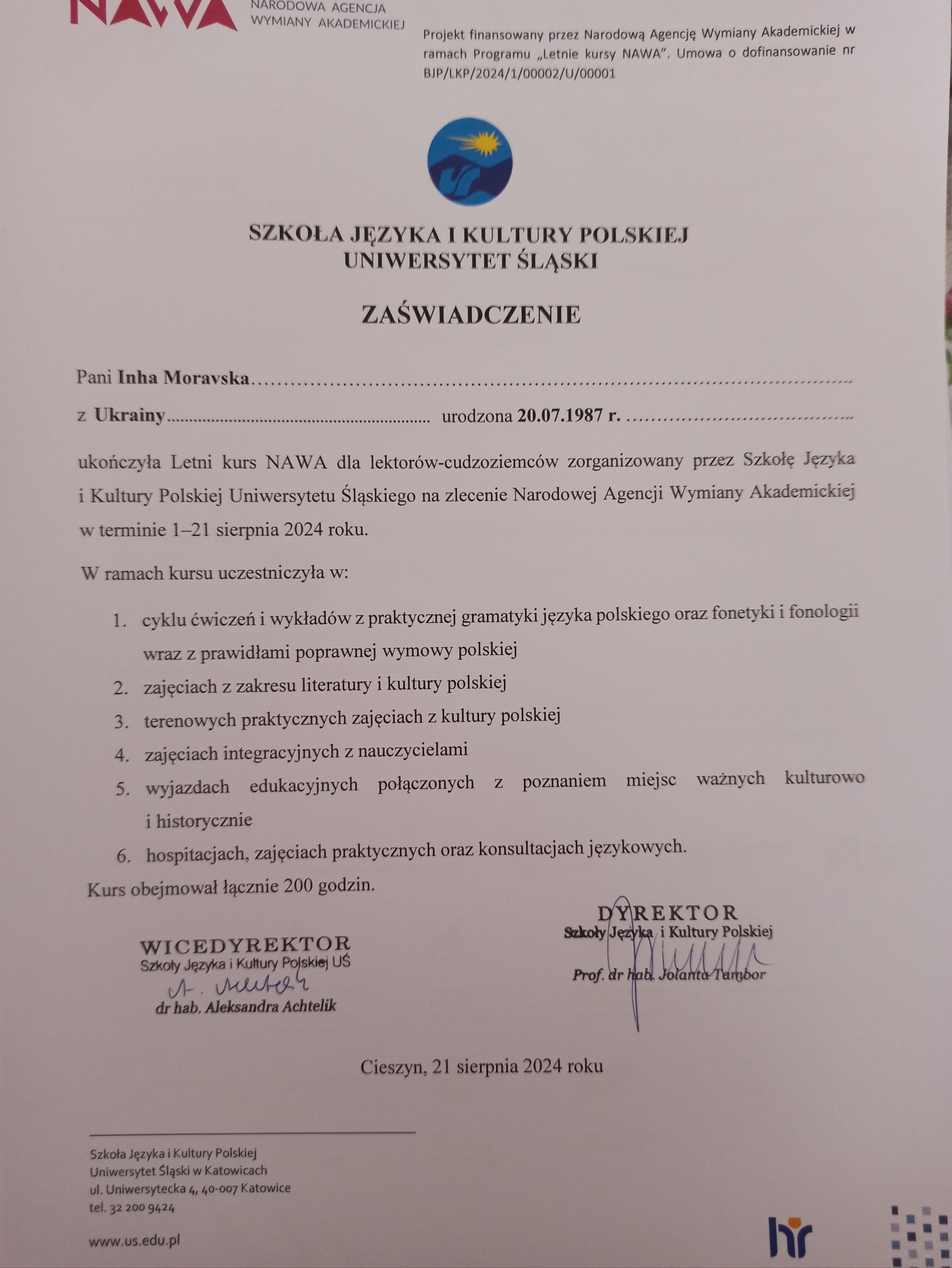 Працюю з учнями шкільного віку, студентами та дорослими, а також допомагаю дітям, які навчаються в польських школах. Маю стажування в Польщі від NAWA для викладачів польської мови, що дозволяє мені застосовувати сучасні підходи та автентичні матеріали в навчанні.