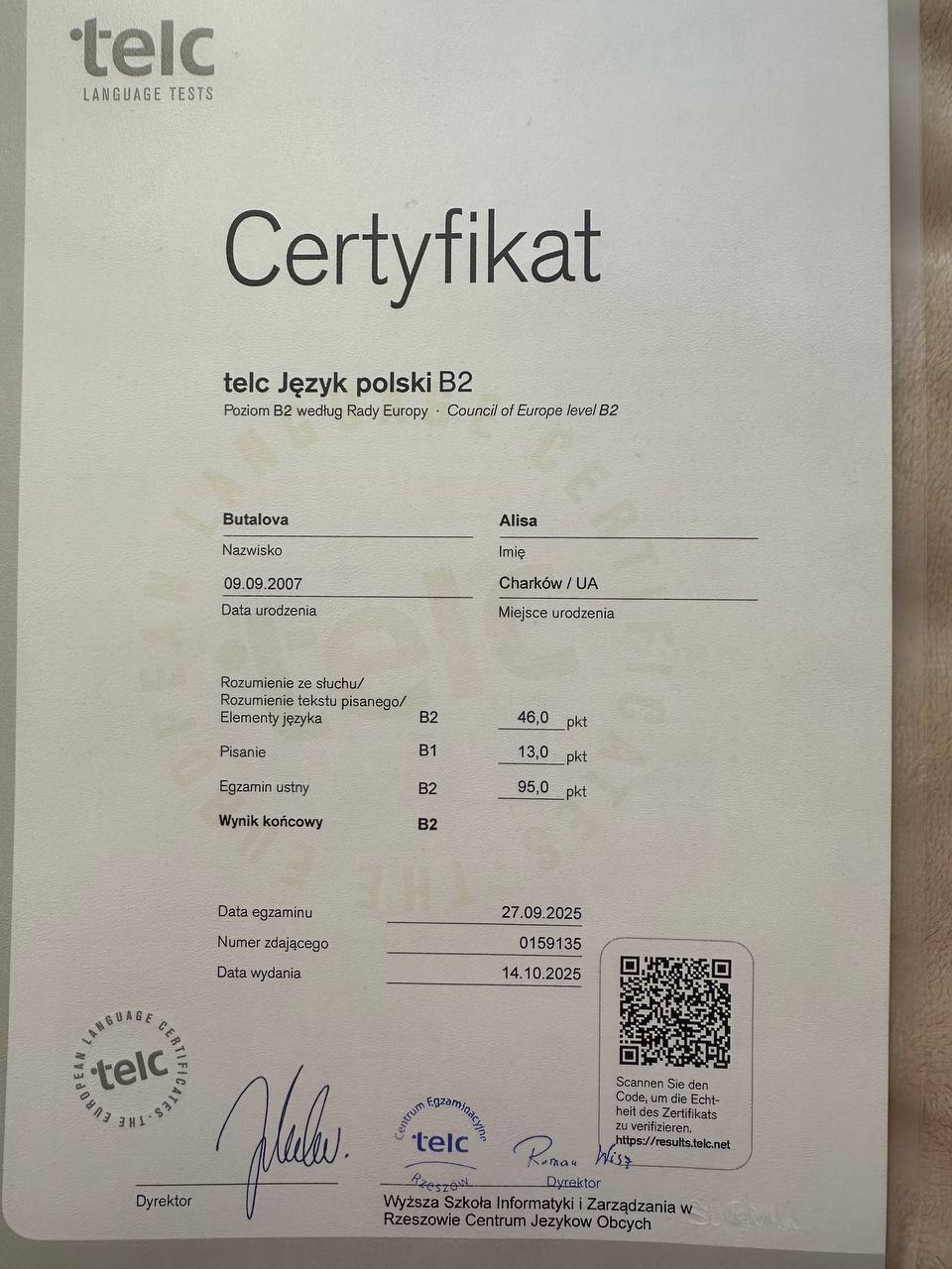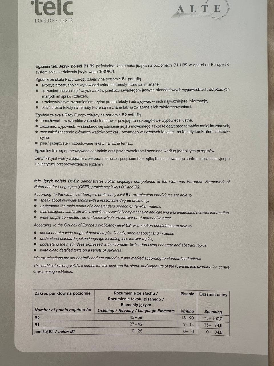 Моя вчителька передала мені величезний багаж знань і інформації про цю не просту, але цікаву мову, тому я хочу ділитися своїми знаннями з іншими. У жовтні я отримала міжнародний сертифікат TELC на рівні B2, який дав мені впевненість в тому, що я не просто так витратила час на вивчення польської.Тому запрошую на заняття вас або ваших дітей!