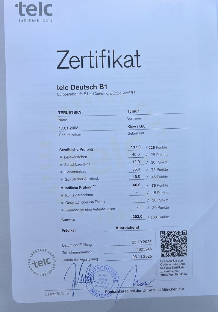 Мене звати Тимур, я з Києва навчався у 16 школі, на данний момент живу у Мюнхені, успішно здав іспит Б1 з німецької мови, за детальнішою інформацією можете написати мені у телеграмм