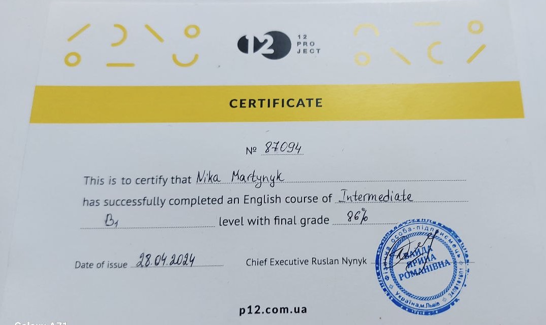 Отже, я Вероніка. Люблю англійську і вже кілька років допомагаю дітям та підліткам її вчити. Закінчила курс Project 12 (B1), наявний рівень англійської (В1/В2).