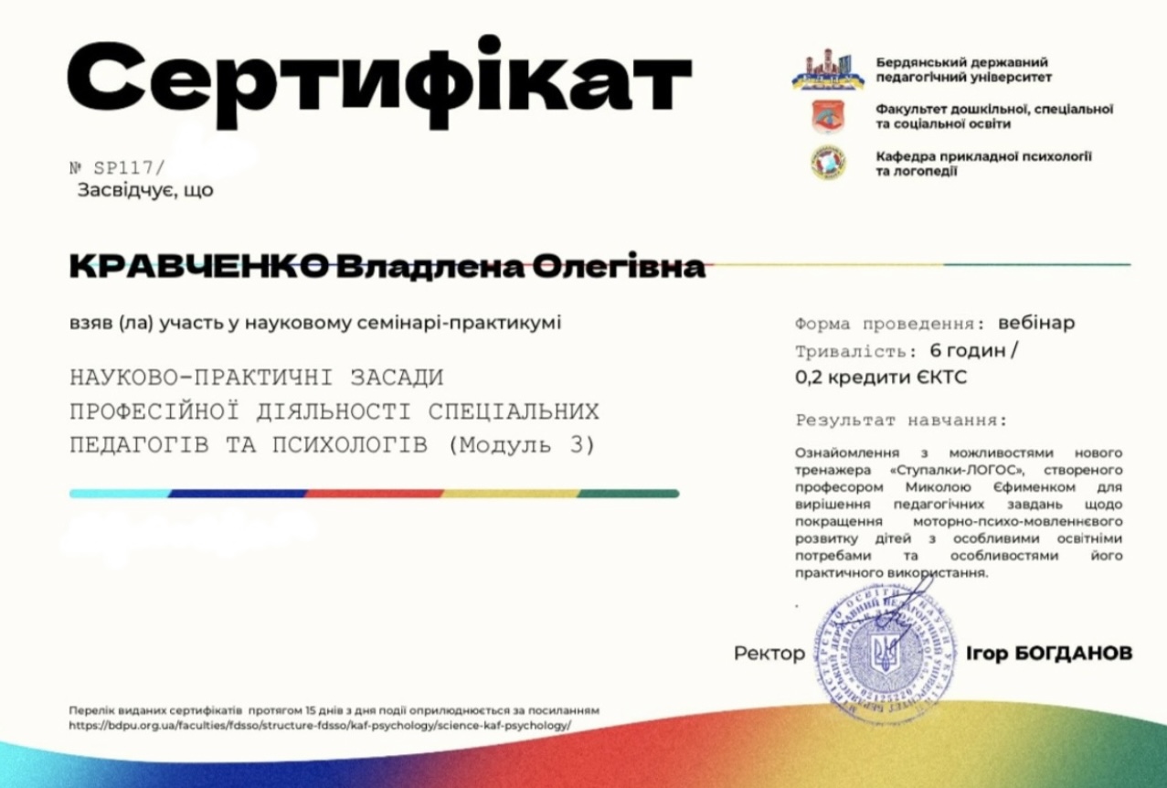 Працюю як логопед-дефектолог, поєднуючи артикуляційні, нейропсихологічні та сенсорно-інтегративні методики. Індивідуальний підхід, ігрові вправи й м’яка корекція забезпечують швидкий прогрес і розвиток упевненого мовлення.