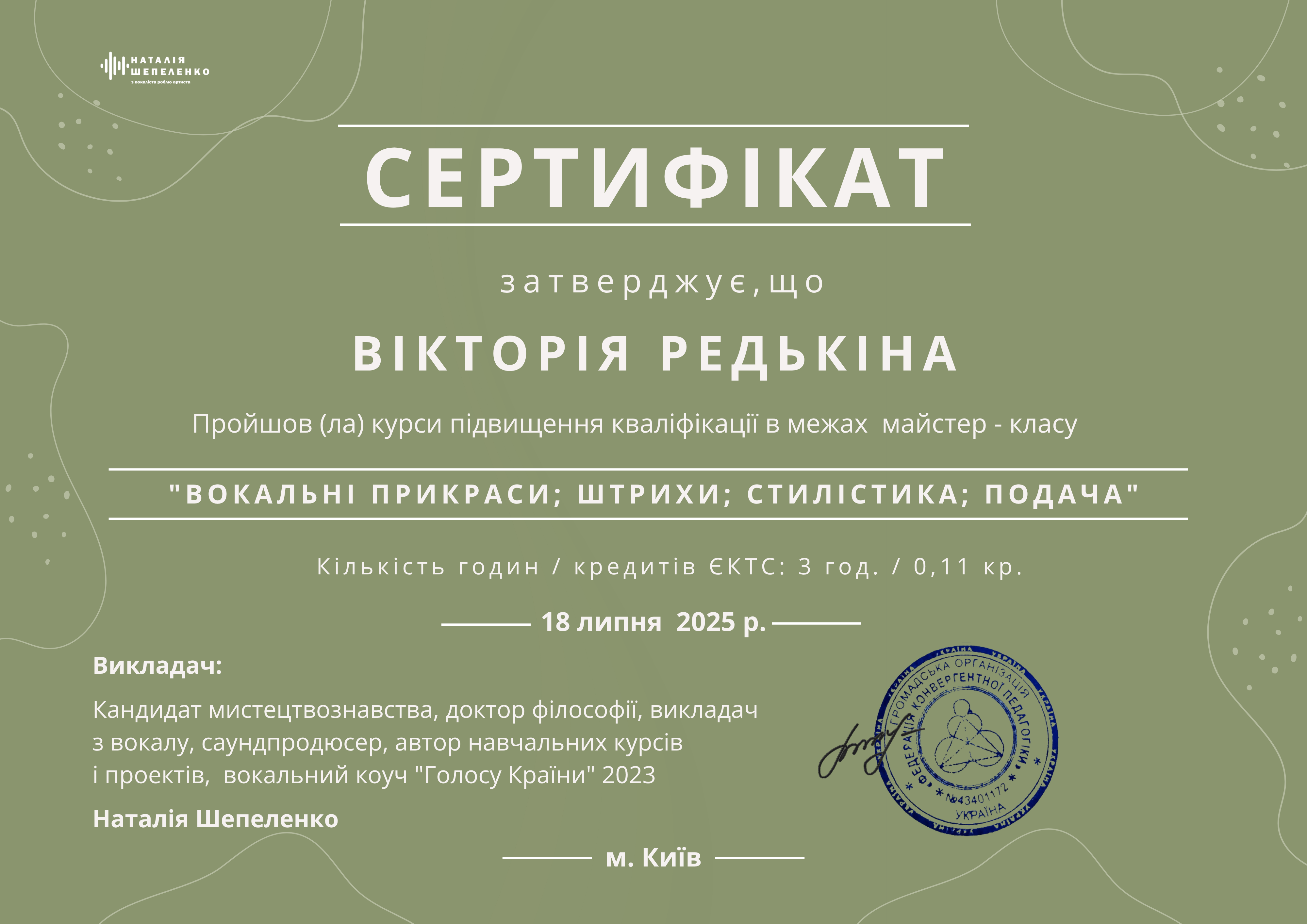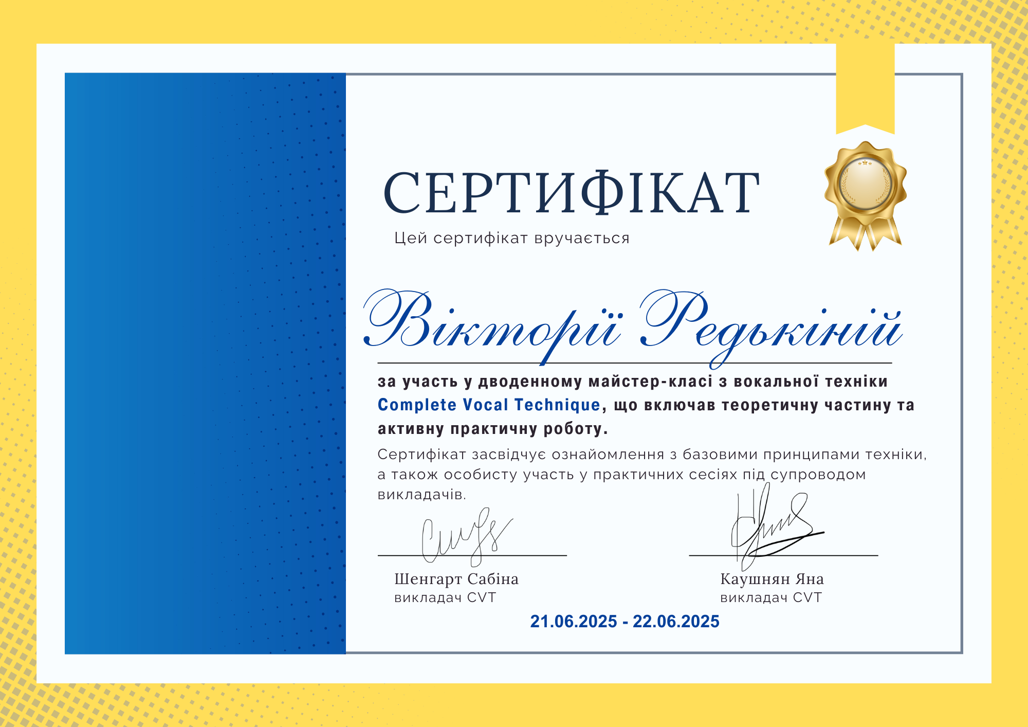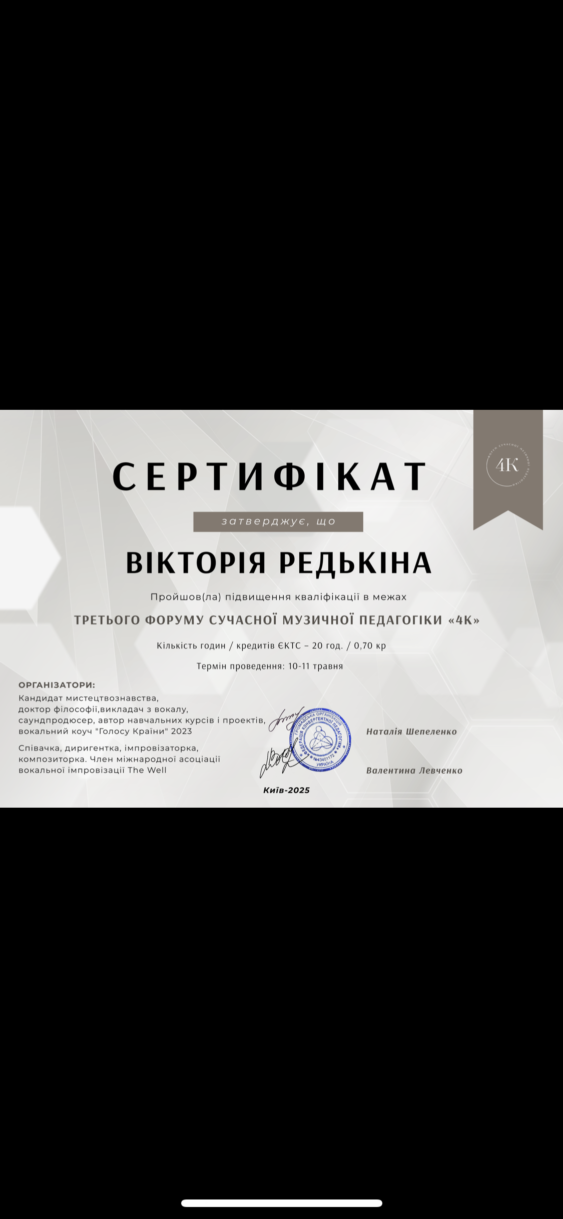 Мене звати Вікторія, мені 22 роки я викладаю вокал для дорослих та дітей. Займаюся вокалом більше 13 років, викладаю вокал майже 5 років. Я переконана, що вокал це навичка, а не талант, тому співати може кожен, якщо навчиться керувати своїм голосом та застосовувати вокальні техніки, якими я володію