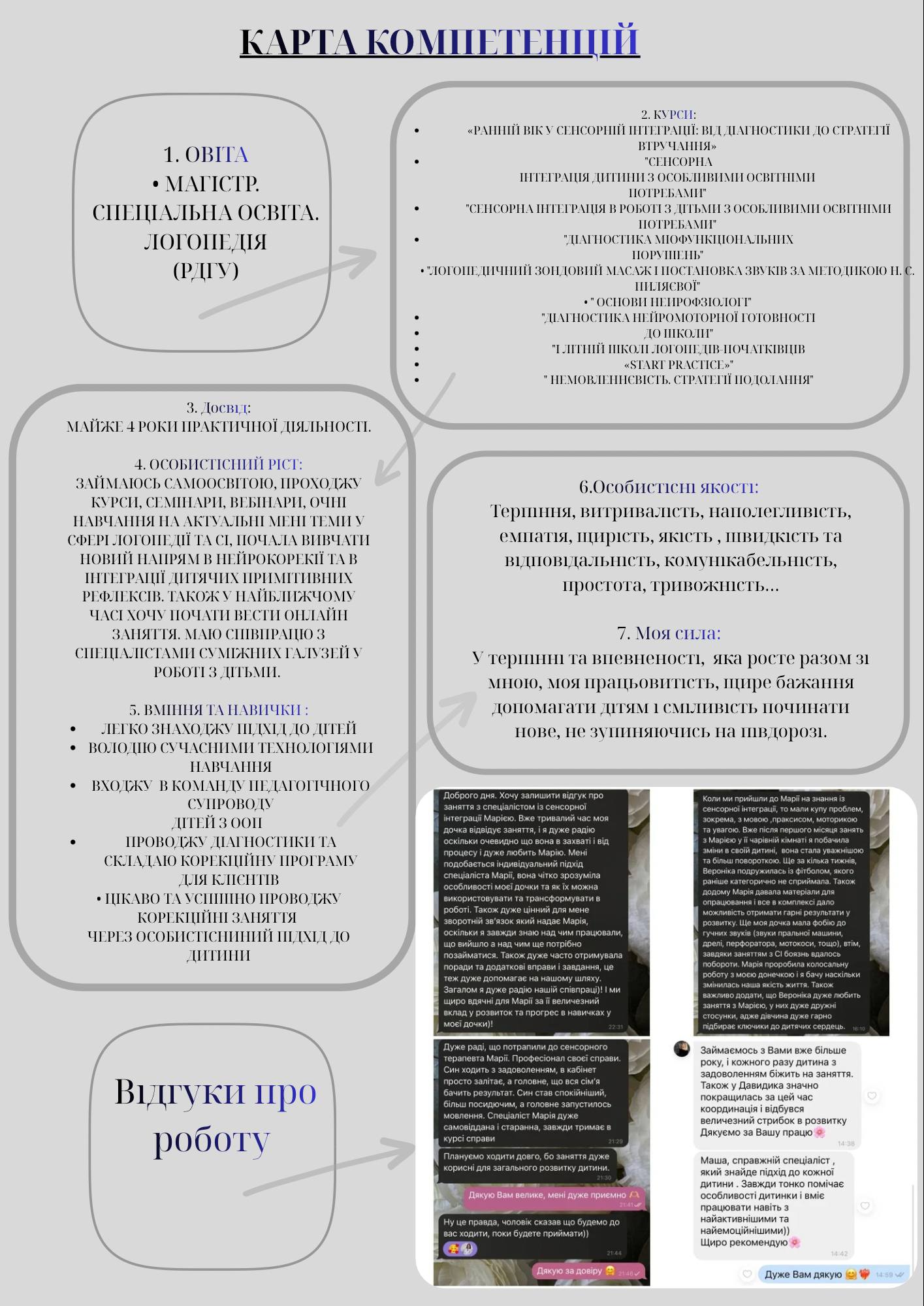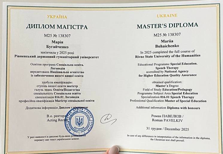 Працюю мʼяко, системно, з опорою на індивідуальні потреби дитини та співпрацю з батьками.Постійно підвищую професійну кваліфікацію у сфері логопедії, сенсорної інтеграції та нерокорекії. Вмію вибудовувати конструктивну комунікацію з батьками та надавати зрозумілі рекомендації для роботи вдома.