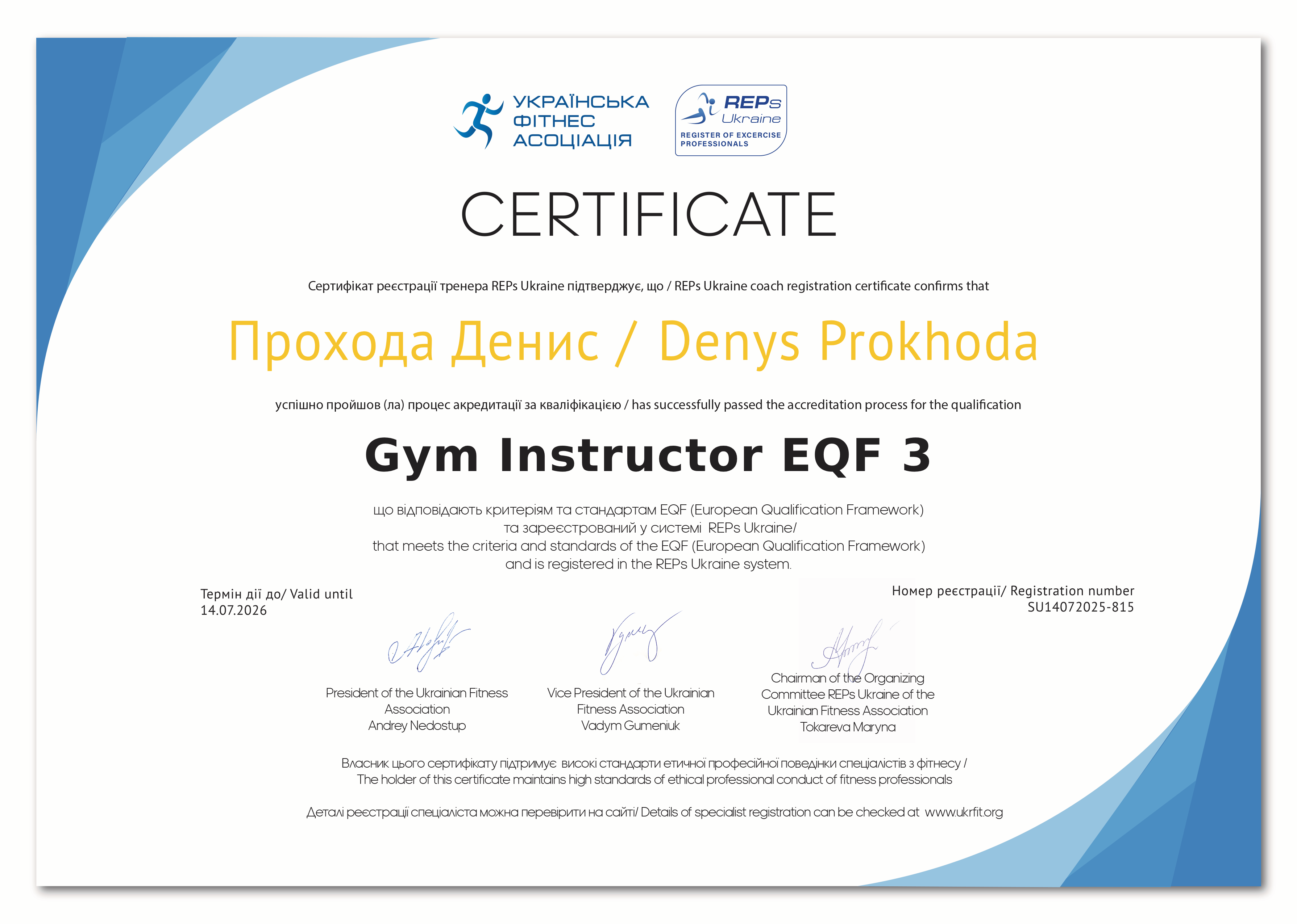 Я сертифікований тренер EREPS з досвідом онлайн-роботи понад рік. За цей час допоміг багатьом підопічним покращити фізичну форму, виробити дисципліну та зробити тренування частиною способу життя. Маю реальні кейси клієнтів із різними цілями: зниження ваги, набір м’язової маси, підвищення витривалості та загального тонусу. Працюю як з дівчатами, так і з хлопцями, незалежно від рівня підготовки. Будую тренування індивідуально — з урахуванням цілей, самопочуття та графіка. Пояснюю логіку вправ і завжди орієнтуюсь на довгостроковий результат, а не швидкі обіцянки.