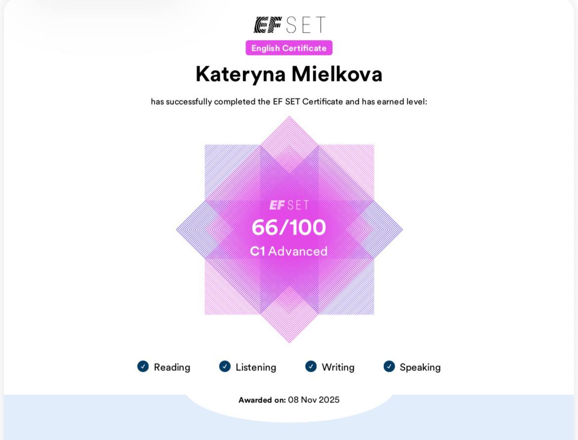 Якщо маєте бажання опанувати англійську та стати master у ній, чекатиму повідомлення на olx або телеграм: katerynmi. See ya!