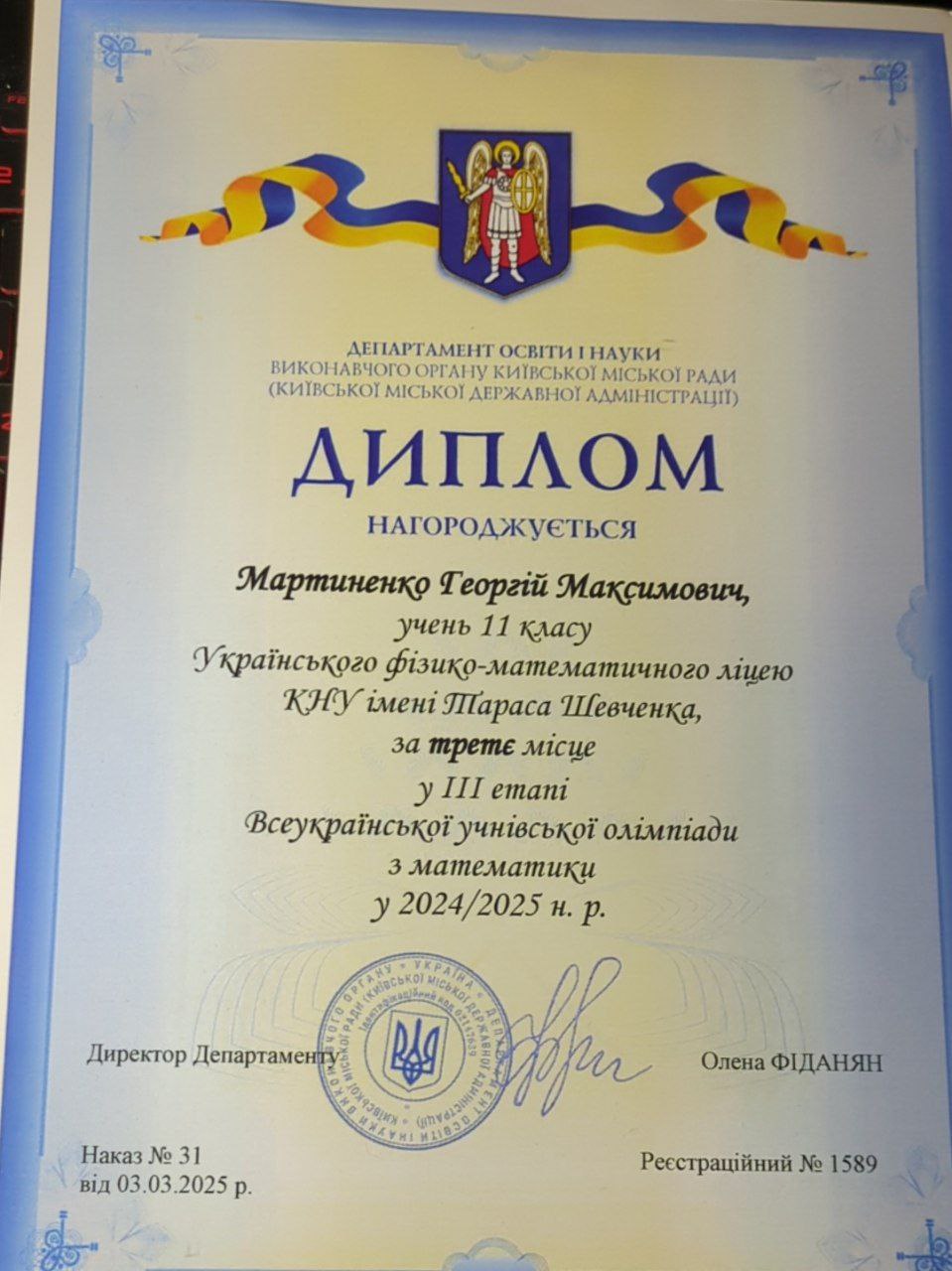 Призер обласного (ІІІ) етапу всеукраїнської олімпіади з математики та фізики, всеукраїнського (IV) - олімпіади з ІТ.