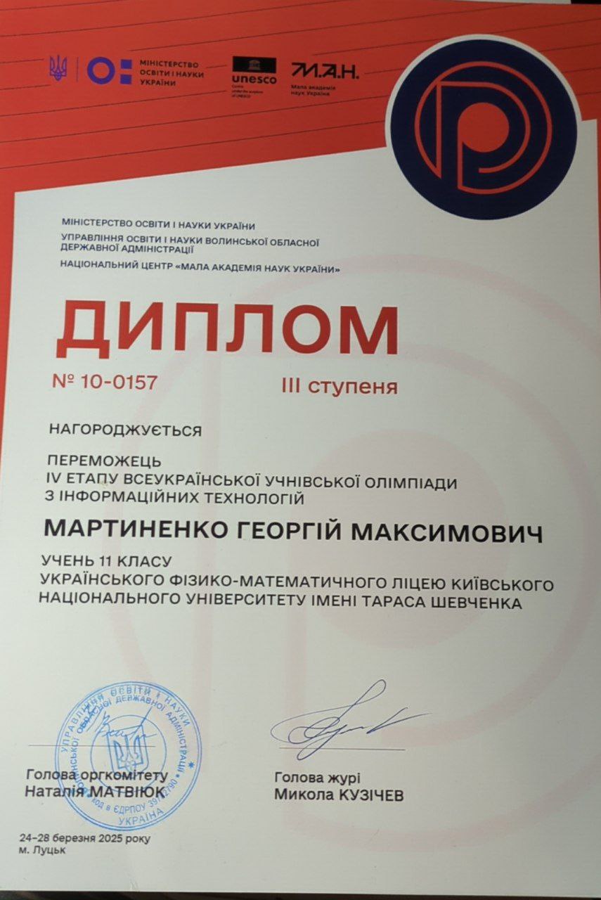 Готую за шкільною програмою (6-11 класи), до НМТ на 180+, до вступних в ліцеї/коледжі з профільної математики та фізики. Випускник УФМЛ КНУ імені Тараса Шевченка 2025 року з відзнакою. Студент першого курсу спеціальності "Прикладна математика". Завжди на зв'язку з учнями за необхідністю. Володію розмовною та професійною англійською.