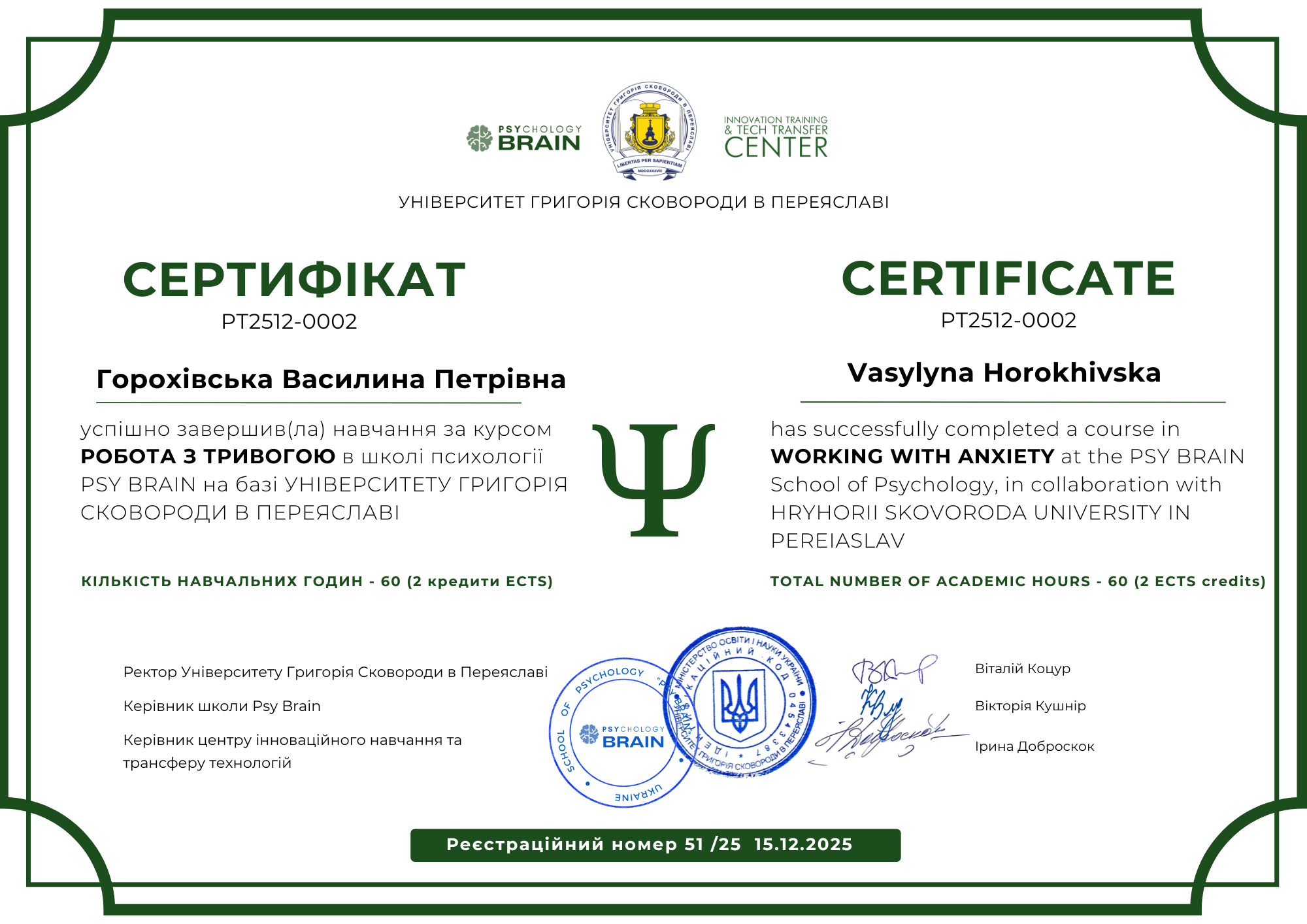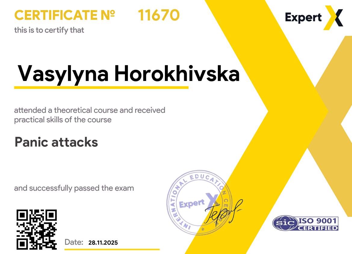 Привіт! Мене звати Василина, я кваліфікований психотерапевт із глибоким досвідом у сфері психології. Я отримала вищу медичну освіту в Україні та підтвердила свій диплом лікаря в Європі. Моя спеціалізація охоплює когнітивно-поведінкову терапію,ERP та методи нейролінгвістичного програмування (НЛП).