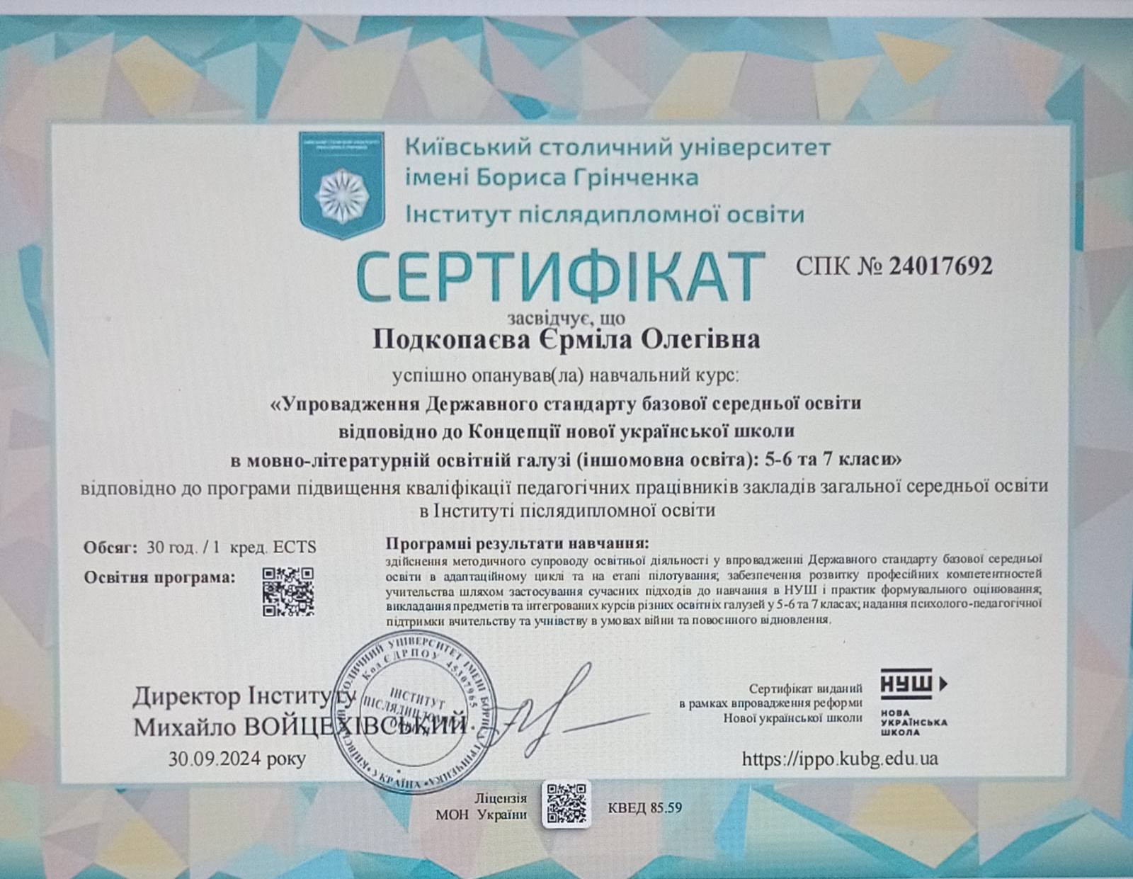 З 2025 року повністю зосередилася на своїй улюбленій справі — приватному викладанні. Оскільки я не поєдную викладання з іншою роботою, тому максимально залучена у ретельну, творчу підготовку до кожного уроку та орієнтована на прогрес моїх учнів. У роботі використовую елементи гейміфікації, інтерактивні завдання, сучасні платформи: Wordwall, Genially, Canva, JustClass, які роблять процес навчання більш цікавим, яскравим і приємним (див.фото).