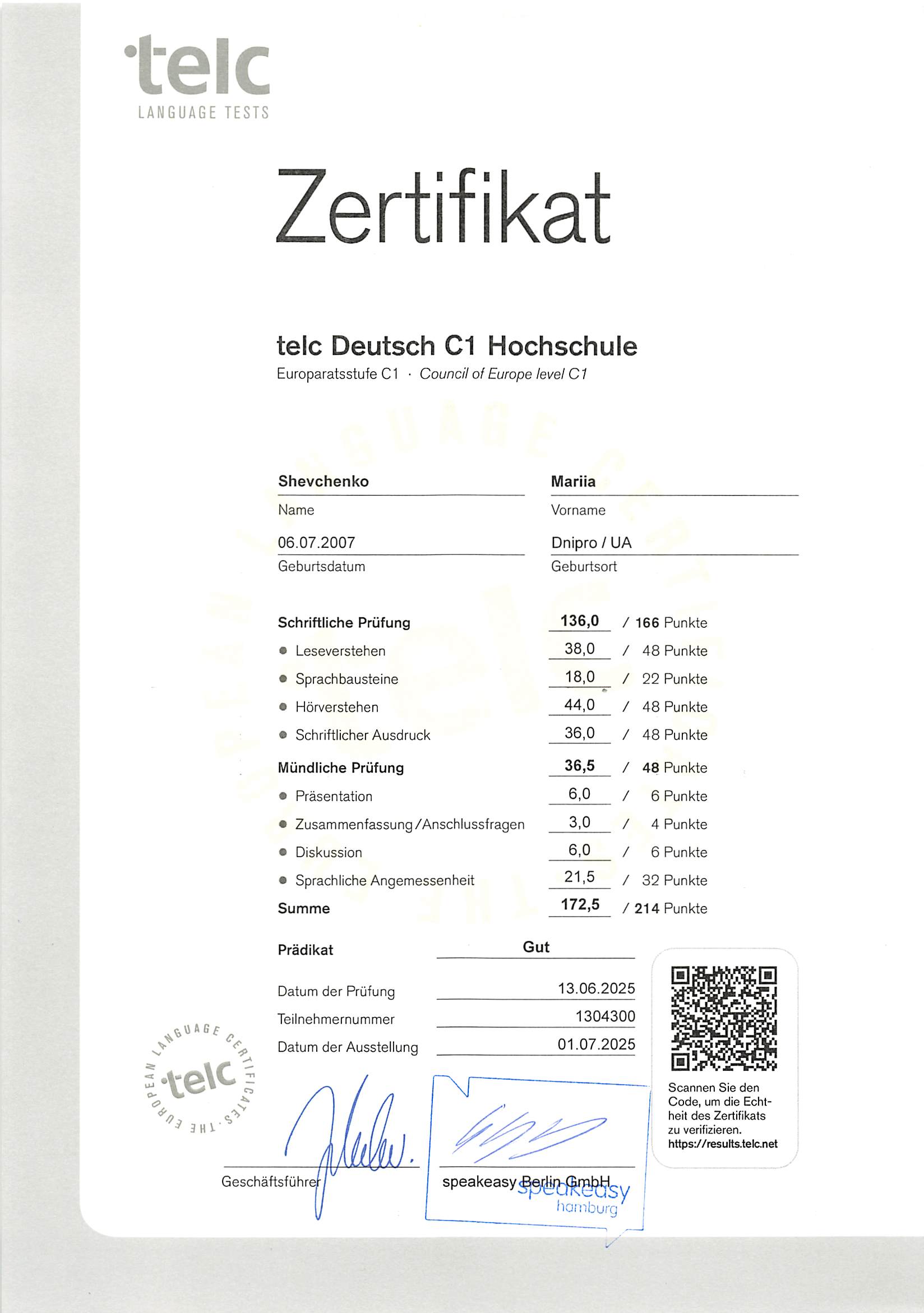 Мене звуть Марія, зараз я навчаюсь в університеті Гамбурга на економічній спеціальності. Також я закінчила Studienkolleg Hamburg минулого року. Рада допомогти дітям від 6 років з німецькою мовою з нуля до рівня B1+. На жаль, зможу проводити заняття лише онлайн, тому що я перебуваю в Гамбурзі.