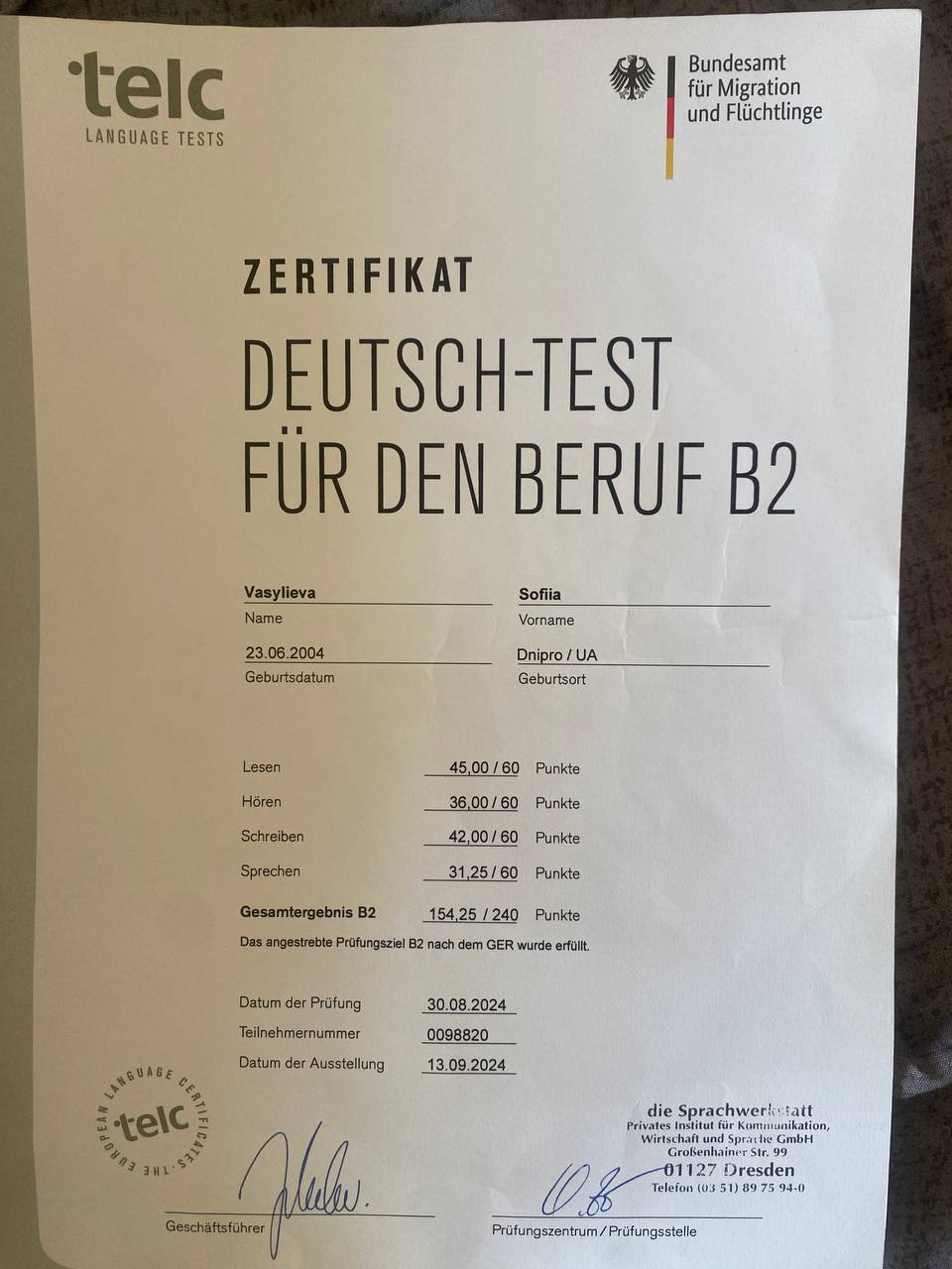 Привіт! Я Софія — твоя подруга у світі німецької мови, яка 3,5 роки проживала в Німеччині, отже транслюю живу німецьку. Маю міжнародні мовні сертифікати, B2
