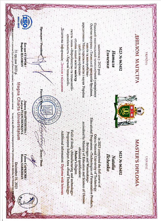Я маю вищу освіту в галузі харчових технологій (бродильні напої), під час якої отримала ґрунтовну підготовку з хімії: органічної, неорганічної, аналітичної, фізичної та біохімії. Хімія була і є моєю професійною основою, з якою я працювала як теоретично, так і на практиці.