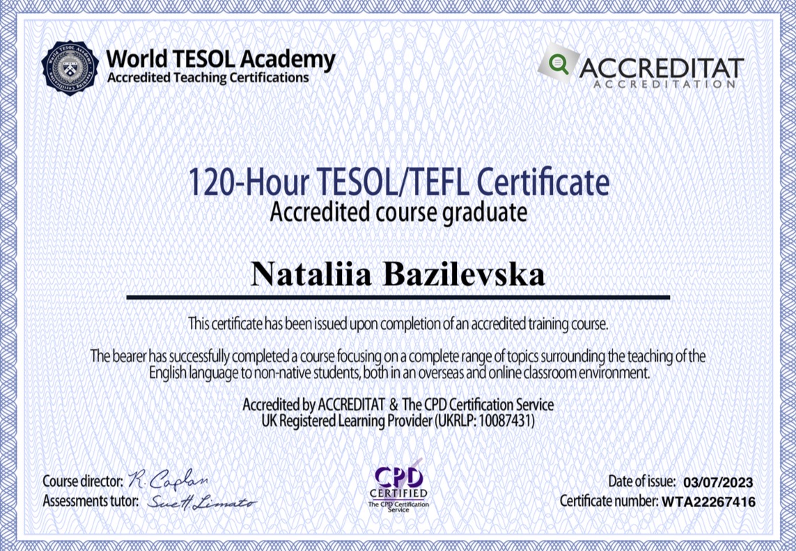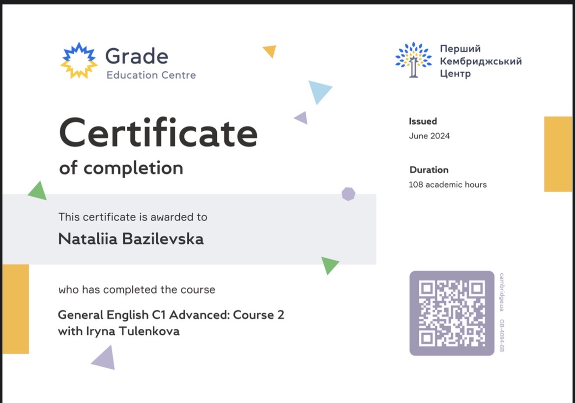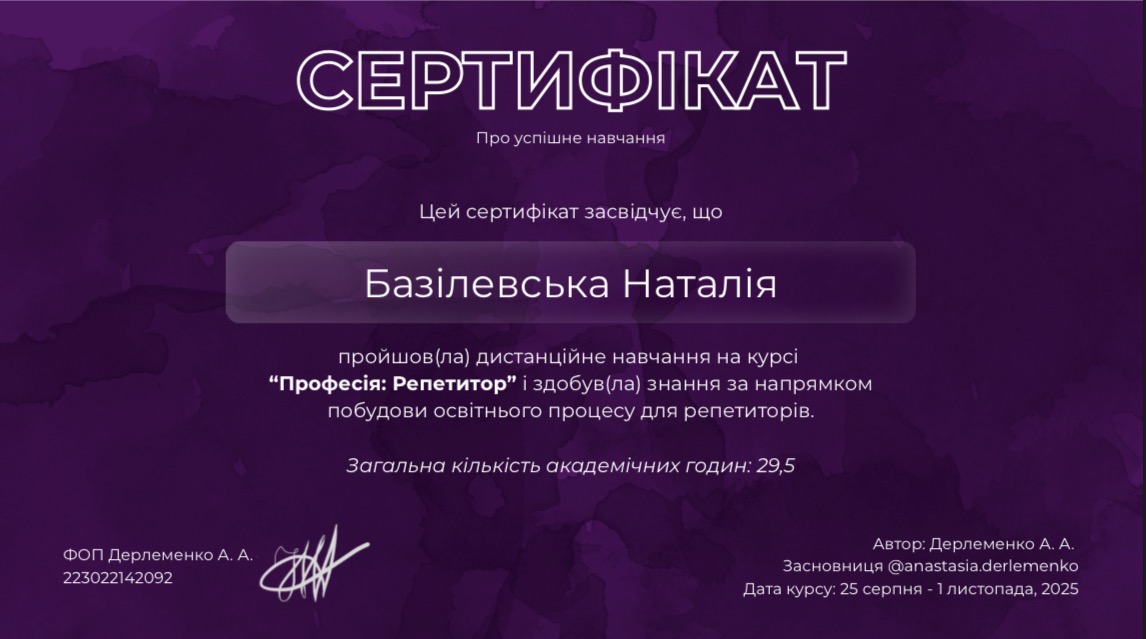 Маю міжнародний досвід професійного навчання та співпраці з іноземними колегами. Для мене важливо, щоб дитина не лише добре вчилася, а й повірила у свої сили, полюбила англійську і реалізувала свої мрії завдяки набутим знанням.
