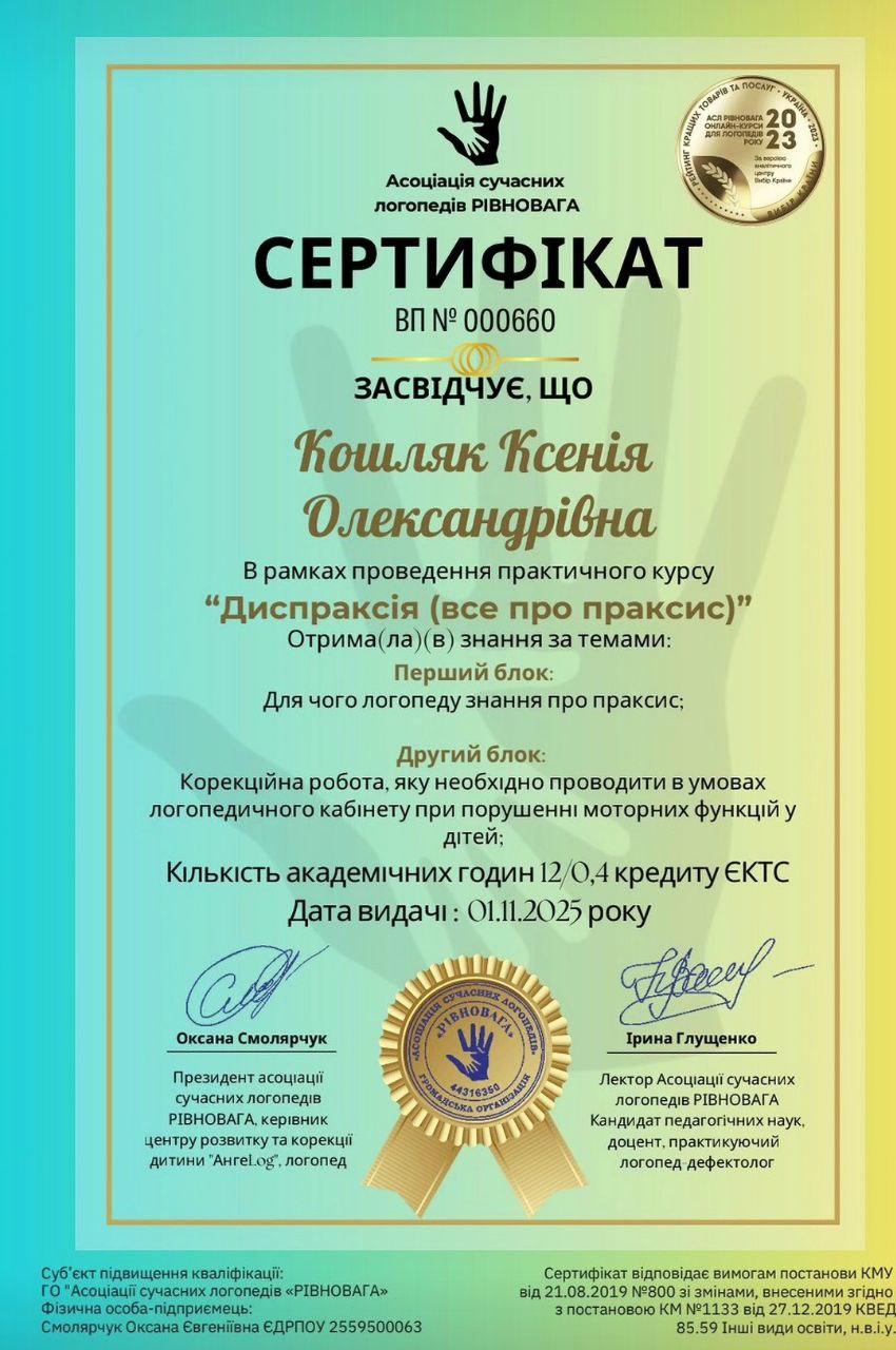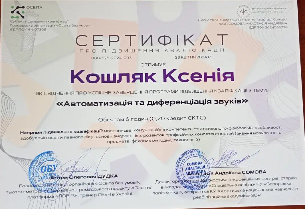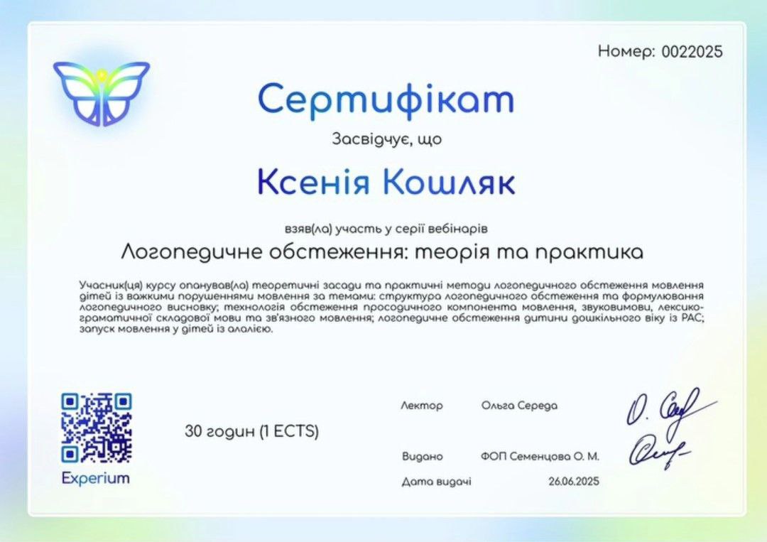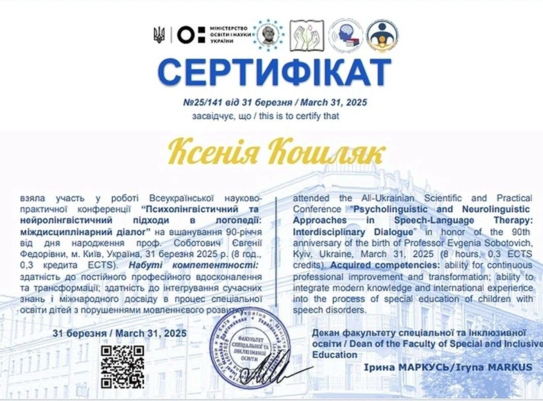 Мене звати Ксенія Олександрівна, я — логопед-дефектолог із багаторічним практичним досвідом роботи з дітьми дошкільного та молодшого шкільного віку. У своїй роботі я поєдную логопедію, елементи нейропсихології та психологічний підхід, адже переконана: ефективна корекція мовлення неможлива без урахування емоційного стану дитини. Я працюю з дітьми з різними мовленнєвими порушеннями — від порушень звуковимови до складних форм мовленнєвого недорозвинення. Особливу увагу приділяю дітям із затримкою мовленнєвого розвитку, дизартрією, ринолалією, а також дітям, яким складно адаптуватися, зосереджувати увагу чи повірити у власні сили. Мій професійний шлях включає роботу в корекційних центрах, індивідуальну практику та групові заняття. Це дало мені можливість бачити дитину не лише в межах одного заняття, а в різних умовах — у взаємодії з батьками, однолітками та навчальним середовищем.На заняттях для мене важливо створити безпечну й підтримуючу атмосферу, де дитина не боїться помилятися, пробувати й розвиватися у власному темпі. Я не працюю за шаблоном — кожна програма корекції складається індивідуально, з урахуванням віку, особливостей розвитку та запиту родини. Окрему увагу я приділяю співпраці з батьками: пояснюю причини труднощів, етапи роботи та надаю рекомендації для закріплення результату вдома. Для мене важливо, щоб батьки були не просто спостерігачами, а активними учасниками процесу розвитку дитини. Я постійно навчаюся, підвищую кваліфікацію та впроваджую сучасні методики у свою практику, адже вірю, що професіоналізм логопеда — це не лише знання, а й гнучкість, уважність і щира зацікавленість у результаті.