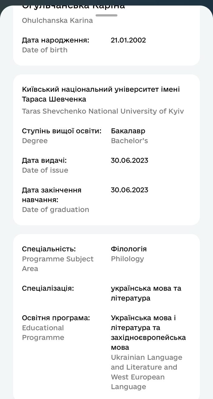 Маю закінчену освіту з української й англійської філології Київського національного університету імені Тараса Шевченка. Поєдную академічні знання з практичним підходом і сучасними методами викладання.