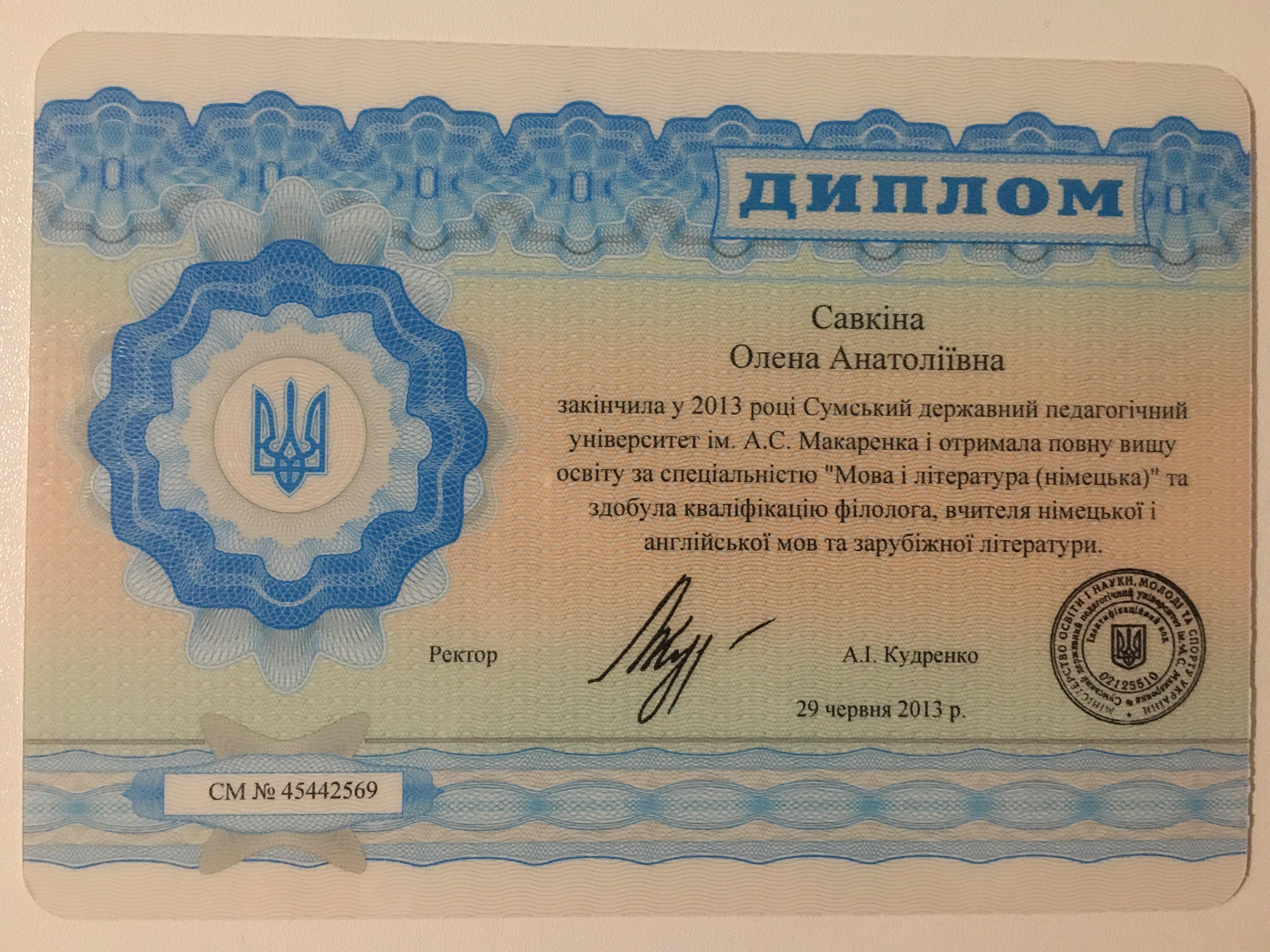 Закінчила я Сумський державний педагогічний університет, де отримала філологічну освіту і здобула спеціальність учителя німецької, англійської і зарубіжної літератури. З тих пір працюю в індивідуальному порядку з учнями різних рівнів і різних вікових категорій.