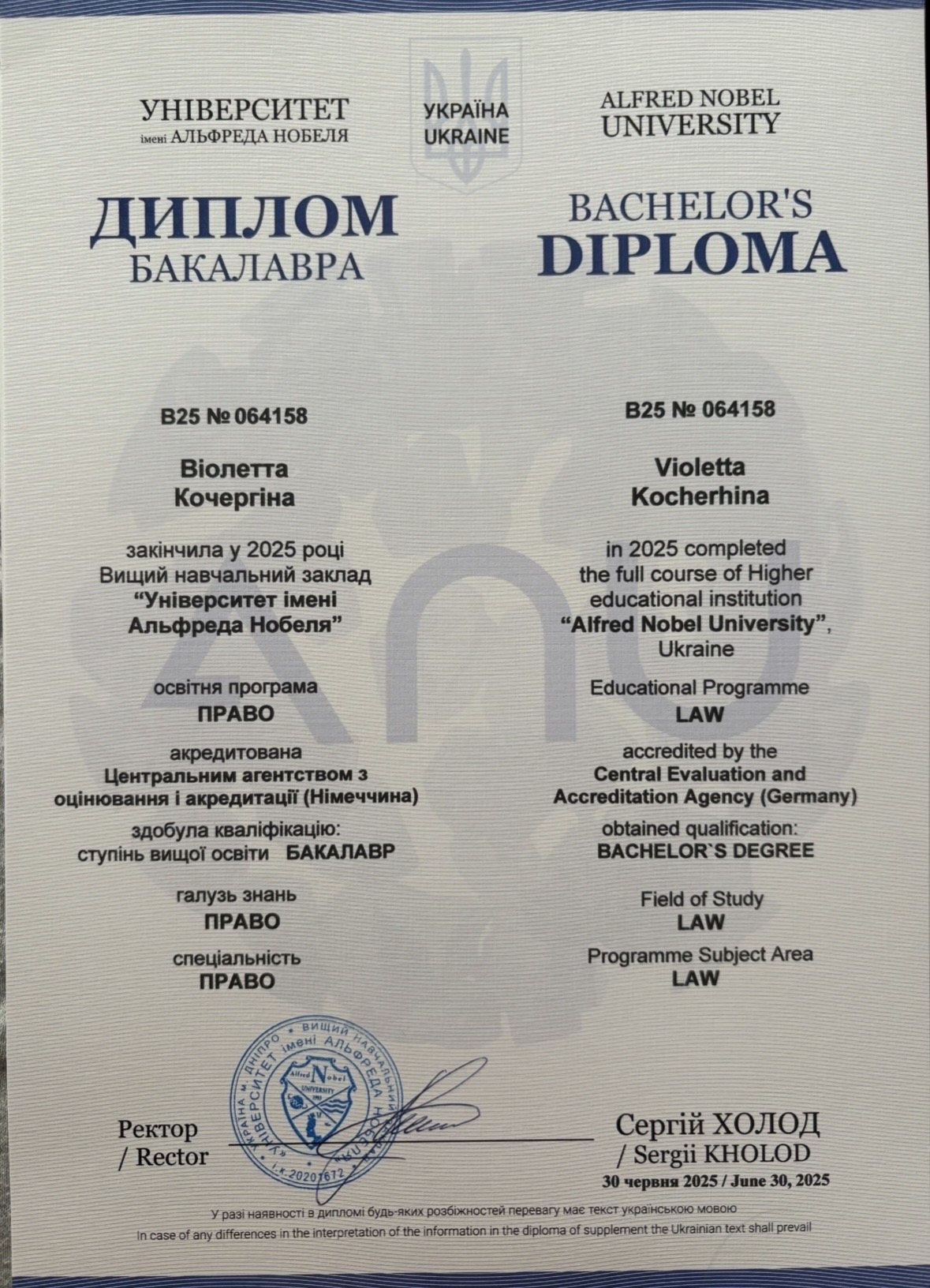 Бакалавр права. Отримую ступінь магістра з міжнародного права в КНУ.