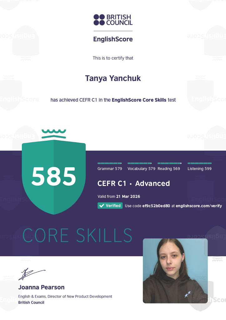 Hello :) Я - Таня, репетиторка англійської з рівнем C1 та 4 роками практики. Допомагаю заговорити англійською через практику, підтримку та індивідуальний підхід. Використовуючи сучасні матеріали і живу мову, навчання виходить ефективним і цікавим.