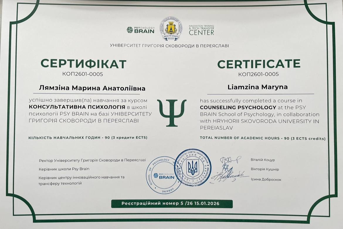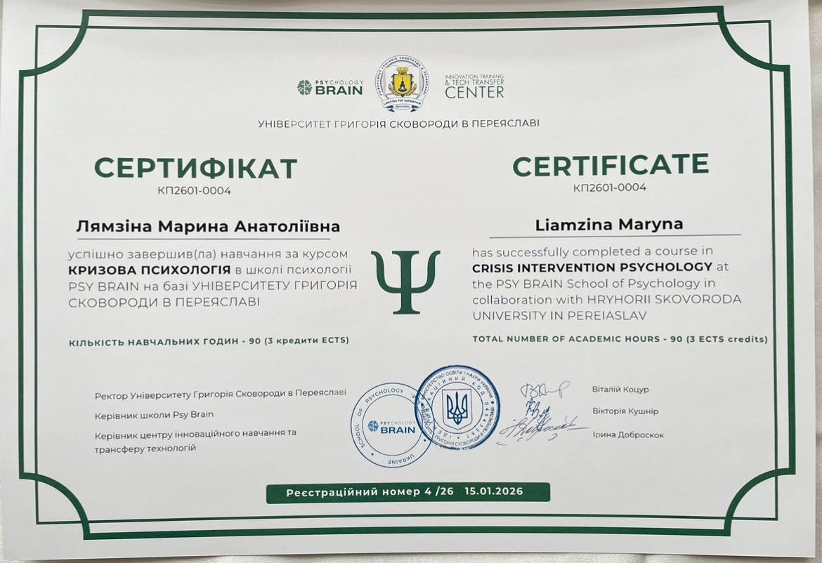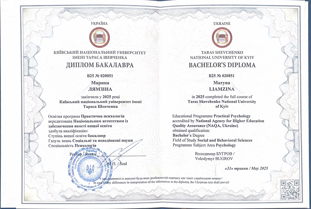 — Психологічна освіта (маю ступінь Бакалавра КНУ імені Тараса Шевченка)